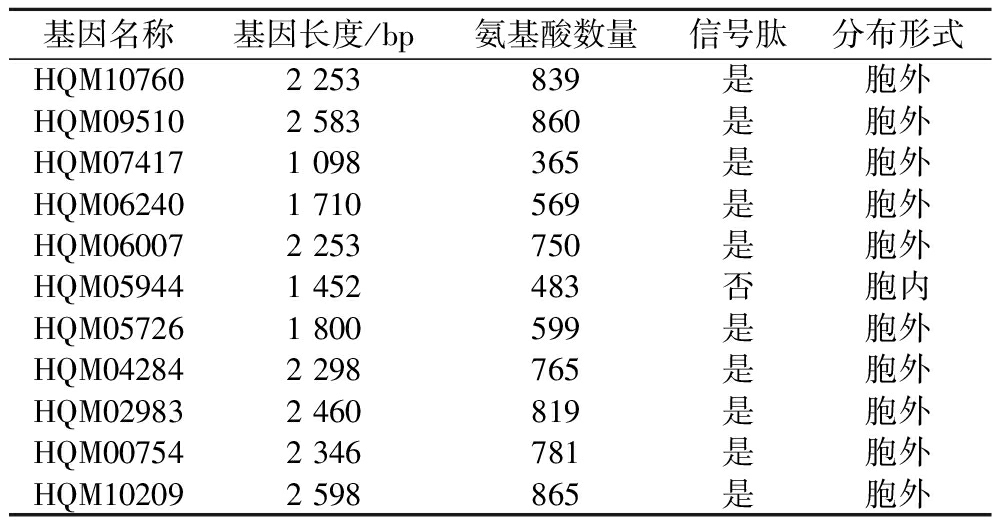 基因名称基因长度/bp氨基酸数量信号肽分布形式HQM107602 253839是胞外HQM095102 583860是胞外HQM074171 098365是胞外HQM062401 710569是胞外HQM060072 253750是胞外HQM059441 452483否胞内HQM057261 800599是胞外HQM042842 298765是胞外HQM029832 460819是胞外HQM007542 346781是胞外HQM102092 598865是胞外