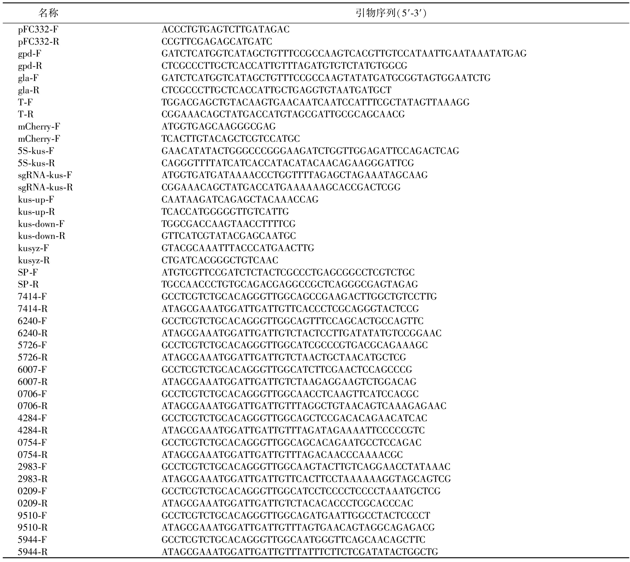 名称 引物序列(5′-3′)pFC332-FACCCTGTGAGTCTTGATAGACpFC332-RCCGTTCGAGAGCATGATCgpd-FGATCTCATGGTCATAGCTGTTTCCGCCAAGTCACGTTGTCCATAATTGAATAAATATGAGgpd-RCTCGCCCTTGCTCACCATTGTTTAGATGTGTCTATGTGGCGgla-FGATCTCATGGTCATAGCTGTTTCCGCCAAGTATATGATGCGGTAGTGGAATCTGgla-RCTCGCCCTTGCTCACCATTGCTGAGGTGTAATGATGCTT-FTGGACGAGCTGTACAAGTGAACAATCAATCCATTTCGCTATAGTTAAAGGT-RCGGAAACAGCTATGACCATGTAGCGATTGCGCAGCAACGmCherry-FATGGTGAGCAAGGGCGAGmCherry-FTCACTTGTACAGCTCGTCCATGC5S-kus-FGAACATATACTGGGCCCGGGAAGATCTGGTTGGAGATTCCAGACTCAG5S-kus-RCAGGGTTTTATCATCACCATACATACAACAGAAGGGATTCGsgRNA-kus-FATGGTGATGATAAAACCCTGGTTTTAGAGCTAGAAATAGCAAGsgRNA-kus-RCGGAAACAGCTATGACCATGAAAAAAGCACCGACTCGGkus-up-FCAATAAGATCAGAGCTACAAACCAGkus-up-RTCACCATGGGGGTTGTCATTGkus-down-FTGGCGACCAAGTAACCTTTTCGkus-down-RGTTCATCGTATACGAGCAATGCkusyz-FGTACGCAAATTTACCCATGAACTTGkusyz-RCTGATCACGGGCTGTCAACSP-FATGTCGTTCCGATCTCTACTCGCCCTGAGCGGCCTCGTCTGCSP-RTGCCAACCCTGTGCAGACGAGGCCGCTCAGGGCGAGTAGAG7414-FGCCTCGTCTGCACAGGGTTGGCAGCCGAAGACTTGGCTGTCCTTG7414-RATAGCGAAATGGATTGATTGTTCACCCTCGCAGGGTACTCCG6240-FGCCTCGTCTGCACAGGGTTGGCAGTTTCCAGCACTGCCAGTTC6240-RATAGCGAAATGGATTGATTGTCTACTCCTTGATATATGTCCGGAAC5726-FGCCTCGTCTGCACAGGGTTGGCATCGCCCGTGACGCAGAAAGC5726-RATAGCGAAATGGATTGATTGTCTAACTGCTAACATGCTCG6007-FGCCTCGTCTGCACAGGGTTGGCATCTTCGAACTCCAGCCCG6007-RATAGCGAAATGGATTGATTGTCTAAGAGGAAGTCTGGACAG0706-FGCCTCGTCTGCACAGGGTTGGCAACCTCAAGTTCATCCACGC0706-RATAGCGAAATGGATTGATTGTTTAGGCTGTAACAGTCAAAGAGAAC4284-FGCCTCGTCTGCACAGGGTTGGCAGCTCCGACACAGAACATCAC4284-RATAGCGAAATGGATTGATTGTTTAGATAGAAAATTCCCCCGTC0754-FGCCTCGTCTGCACAGGGTTGGCAGCACAGAATGCCTCCAGAC0754-RATAGCGAAATGGATTGATTGTTTAGACAACCCAAAACGC2983-FGCCTCGTCTGCACAGGGTTGGCAAGTACTTGTCAGGAACCTATAAAC2983-RATAGCGAAATGGATTGATTGTTCACTTCCTAAAAAAGGTAGCAGTCG0209-FGCCTCGTCTGCACAGGGTTGGCATCCTCCCCTCCCCTAAATGCTCG0209-RATAGCGAAATGGATTGATTGTCTACACACCCTCGCACCCAC9510-FGCCTCGTCTGCACAGGGTTGGCAGATGAATTGGCCTACTCCCCT9510-RATAGCGAAATGGATTGATTGTTTAGTGAACAGTAGGCAGAGACG5944-FGCCTCGTCTGCACAGGGTTGGCAATGGGTTCAGCAACAGCTTC5944-RATAGCGAAATGGATTGATTGTTTATTTCTTCTCGATATACTGGCTG