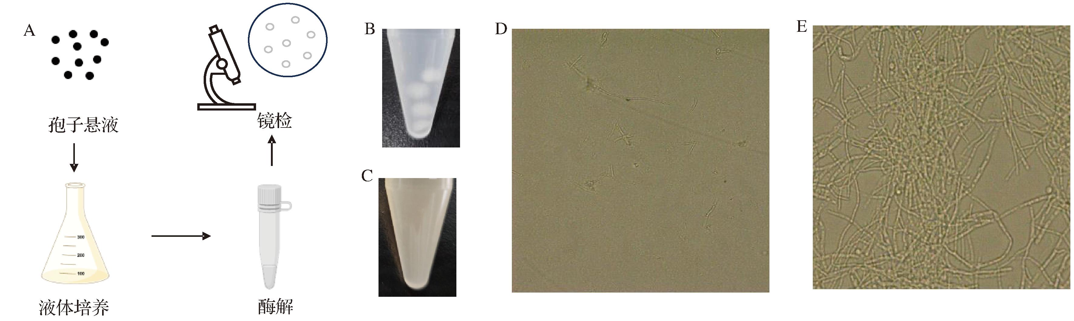 A-黑曲霉菌丝体酶解流程;B-溶壁酶处理黑曲霉菌丝;C-复合酶处理黑曲霉菌丝;D-溶壁酶处理黑曲霉菌丝镜检;E-复合酶处理黑曲霉菌丝镜检