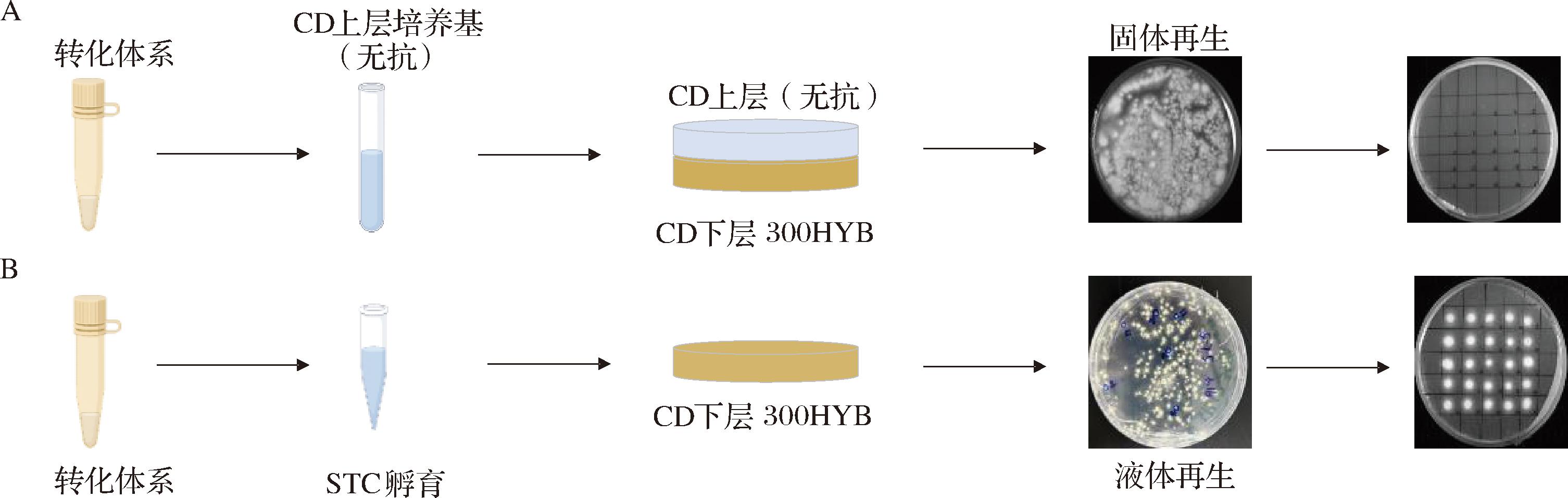 A-原生质体的固体再生;B-原生质体的液体再生