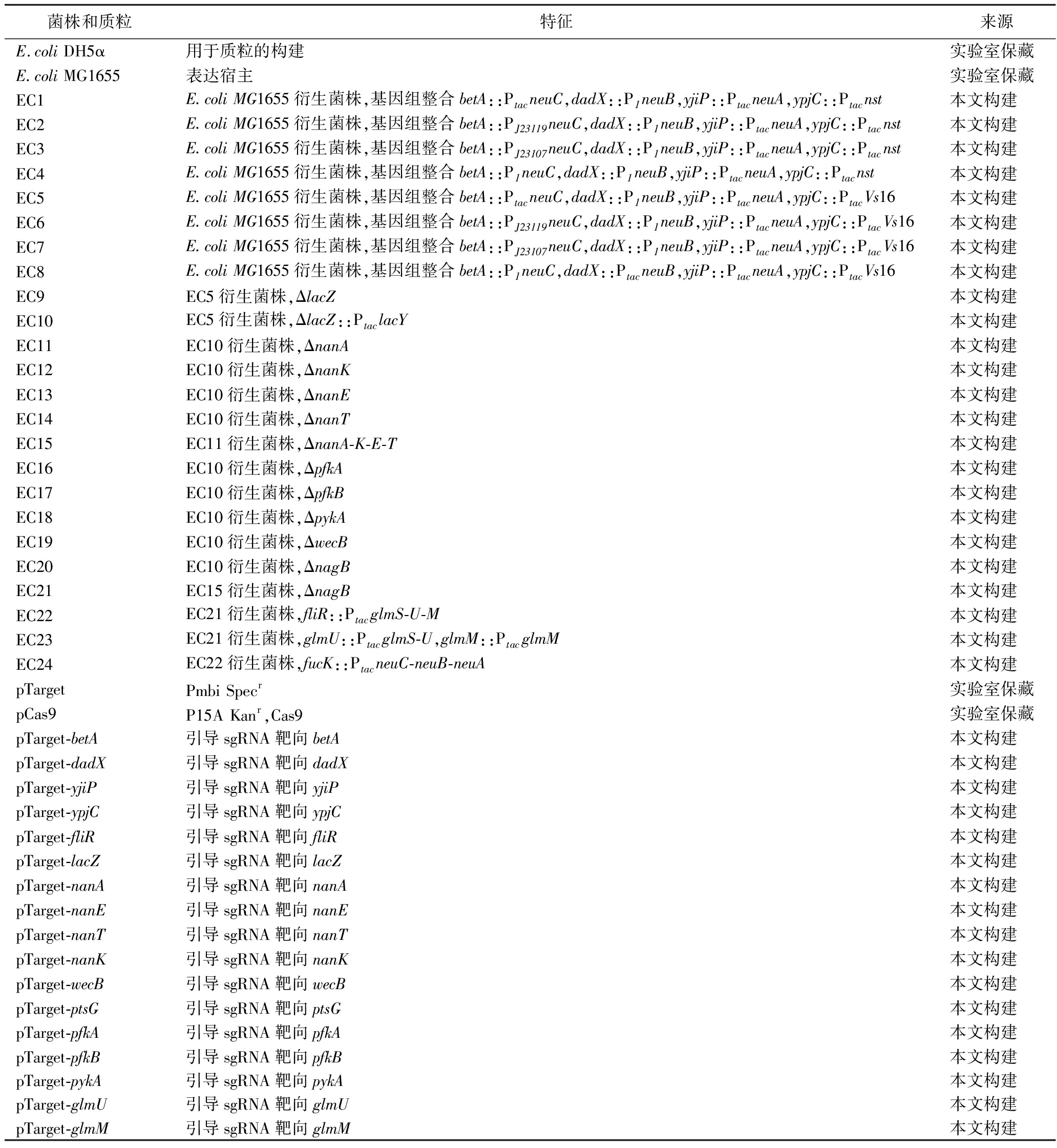 菌株和质粒特征来源E.coli DH5α用于质粒的构建实验室保藏E.coli MG1655表达宿主实验室保藏EC1E.coli MG1655衍生菌株,基因组整合betA::PtacneuC,dadX::P1neuB,yjiP::PtacneuA,ypjC::Ptacnst本文构建EC2E.coli MG1655衍生菌株,基因组整合betA::PJ23119neuC,dadX::P1neuB,yjiP::PtacneuA,ypjC::Ptacnst本文构建EC3E.coli MG1655衍生菌株,基因组整合betA::PJ23107neuC,dadX::P1neuB,yjiP::PtacneuA,ypjC::Ptacnst本文构建EC4E.coli MG1655衍生菌株,基因组整合betA::P1neuC,dadX::P1neuB,yjiP::PtacneuA,ypjC::Ptacnst本文构建EC5E.coli MG1655衍生菌株,基因组整合betA::PtacneuC,dadX::P1neuB,yjiP::PtacneuA,ypjC::PtacVs16本文构建EC6E.coli MG1655衍生菌株,基因组整合betA::PJ23119neuC,dadX::P1neuB,yjiP::PtacneuA,ypjC::PtacVs16本文构建EC7E.coli MG1655衍生菌株,基因组整合betA::PJ23107neuC,dadX::P1neuB,yjiP::PtacneuA,ypjC::PtacVs16本文构建EC8E.coli MG1655衍生菌株,基因组整合betA::P1neuC,dadX::PtacneuB,yjiP::PtacneuA,ypjC::PtacVs16本文构建EC9EC5衍生菌株,ΔlacZ本文构建EC10EC5衍生菌株,ΔlacZ::PtaclacY本文构建EC11EC10衍生菌株,ΔnanA本文构建EC12EC10衍生菌株,ΔnanK本文构建EC13EC10衍生菌株,ΔnanE本文构建EC14EC10衍生菌株,ΔnanT本文构建EC15EC11衍生菌株,ΔnanA-K-E-T本文构建EC16EC10衍生菌株,ΔpfkA本文构建EC17EC10衍生菌株,ΔpfkB本文构建EC18EC10衍生菌株,ΔpykA本文构建EC19EC10衍生菌株,ΔwecB本文构建EC20EC10衍生菌株,ΔnagB本文构建EC21EC15衍生菌株,ΔnagB本文构建EC22EC21衍生菌株,fliR::PtacglmS-U-M本文构建EC23EC21衍生菌株,glmU::PtacglmS-U,glmM::PtacglmM本文构建EC24EC22衍生菌株,fucK::PtacneuC-neuB-neuA本文构建pTargetPmbi Specr实验室保藏pCas9P15A Kanr,Cas9实验室保藏pTarget-betA引导sgRNA靶向betA本文构建pTarget-dadX引导sgRNA靶向dadX本文构建pTarget-yjiP引导sgRNA靶向yjiP本文构建pTarget-ypjC引导sgRNA靶向ypjC本文构建pTarget-fliR引导sgRNA靶向fliR本文构建pTarget-lacZ引导sgRNA靶向lacZ本文构建pTarget-nanA引导sgRNA靶向nanA本文构建pTarget-nanE引导sgRNA靶向nanE本文构建pTarget-nanT引导sgRNA靶向nanT本文构建pTarget-nanK引导sgRNA靶向nanK本文构建pTarget-wecB引导sgRNA靶向wecB本文构建pTarget-ptsG引导sgRNA靶向ptsG本文构建pTarget-pfkA引导sgRNA靶向pfkA本文构建pTarget-pfkB引导sgRNA靶向pfkB本文构建pTarget-pykA引导sgRNA靶向pykA本文构建pTarget-glmU引导sgRNA靶向glmU本文构建pTarget-glmM引导sgRNA靶向glmM本文构建