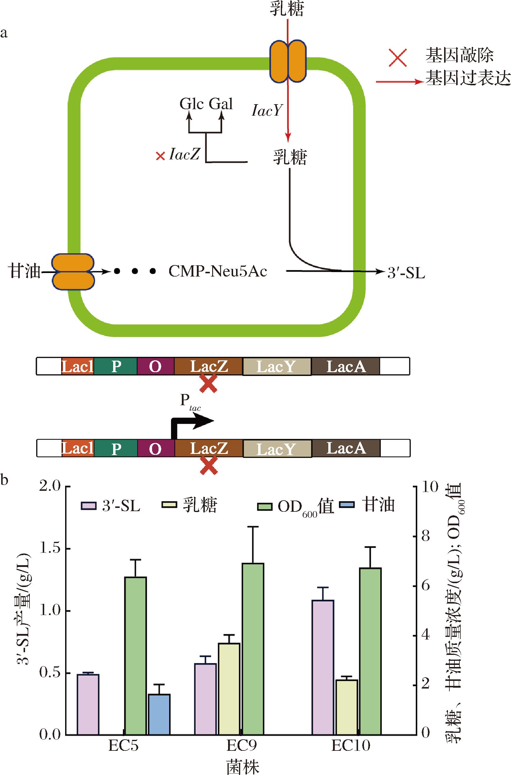 为进一步优化乳糖利用效率,在lacZ敲除菌株EC9基础上强化表达了乳糖通透酶编码基因lacY获得菌株EC10。通过对EC10菌株摇瓶发酵液进行检测,乳糖质量浓度从3.7 g/L降低到2.24 g/L,这可能是因lacY的高表达增加乳糖向胞内转运,增加细胞内乳糖的供应使3′-SL产量最终提升至1.09 g/L,该双重改造菌株EC10展现出协同效应(图4-b),本研究较FIERFORT等[16]报道的lacZ单敲除菌株(0.43 g/L)显著提高0.66 g/L(相对提升153%)。对比EC9与EC10菌株的转化效率差异:前者虽然阻断分解途径,但由于lacY天然表达水平限制,乳糖转运速率成为新的限速步骤。该现象突显代谢工程中代谢流平衡调控的重要性——单纯阻断分解途径虽能积累中间产物,但必须同步强化底物转运能力才能实现代谢网络的整体优化。在理想情况下,1 mol乳糖与1 mol CMP-唾液酸(CMP-Neu5 Ac)反应可生成1 mol 3′-SL,但实际产率受酶活性限制导致转化效率差异(如NeuB、NeuA、NeuC等催化酶效能不同)、底物供应不足(乳糖、CMP-Neu5 Ac等)及副反应损耗(乳糖分解与中间产物代谢分流)的多重制约,EC10菌株消耗1 mol乳糖仅产生0.076 mol 3′-SL,所以后续的高产菌株开发需协调分解代谢抑制与转运/合成模块。