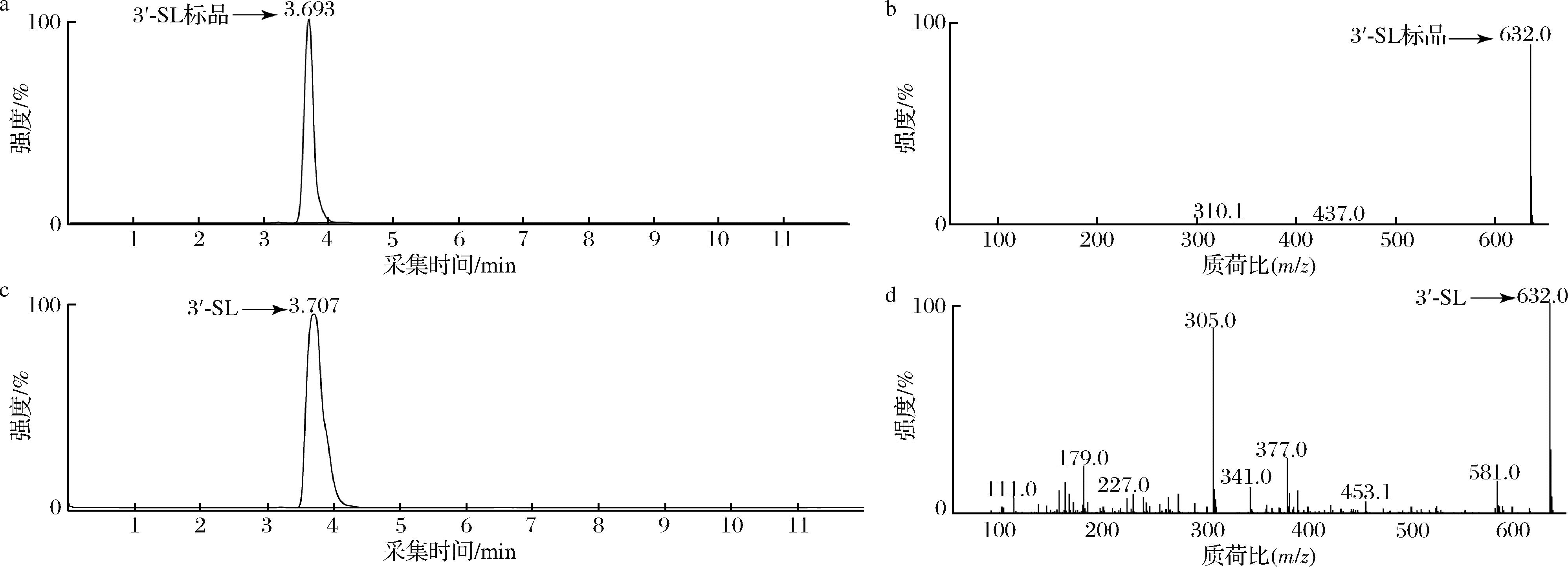 a-3′-SL标准品的LC谱图;b-3′-SL标准品LC峰在3.7 min处的ESI-MS谱图;c-菌株EC1摇瓶培养物的LC谱图;d-菌株EC1摇瓶培养物LC峰在3.7 min处的ESI-MS谱图