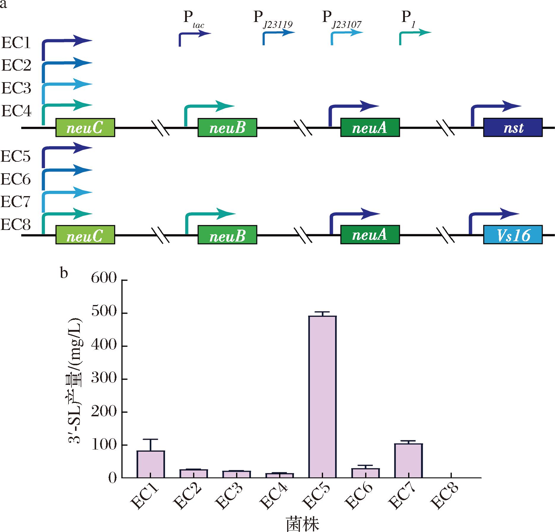 在此基础上,对2种不同来源的α-2,3-唾液酸转移酶Nst(N.meningitidis)与Vs16(Vibrio sp.JT-FAJ-16)进行了对比。数据结果显示,采用Vs16的EC5菌株3′-SL产量达到492.51 mg/L,较采用Nst的EC1菌株提升了4.9倍(图2-b)。在Nst菌株体系中,EC2和EC3的产量分别为26.29和21.89 mg/L;而采用Vs16系统的对应菌株EC6(29.81 mg/L)和EC7(105.58 mg/L)均呈现更高产量。