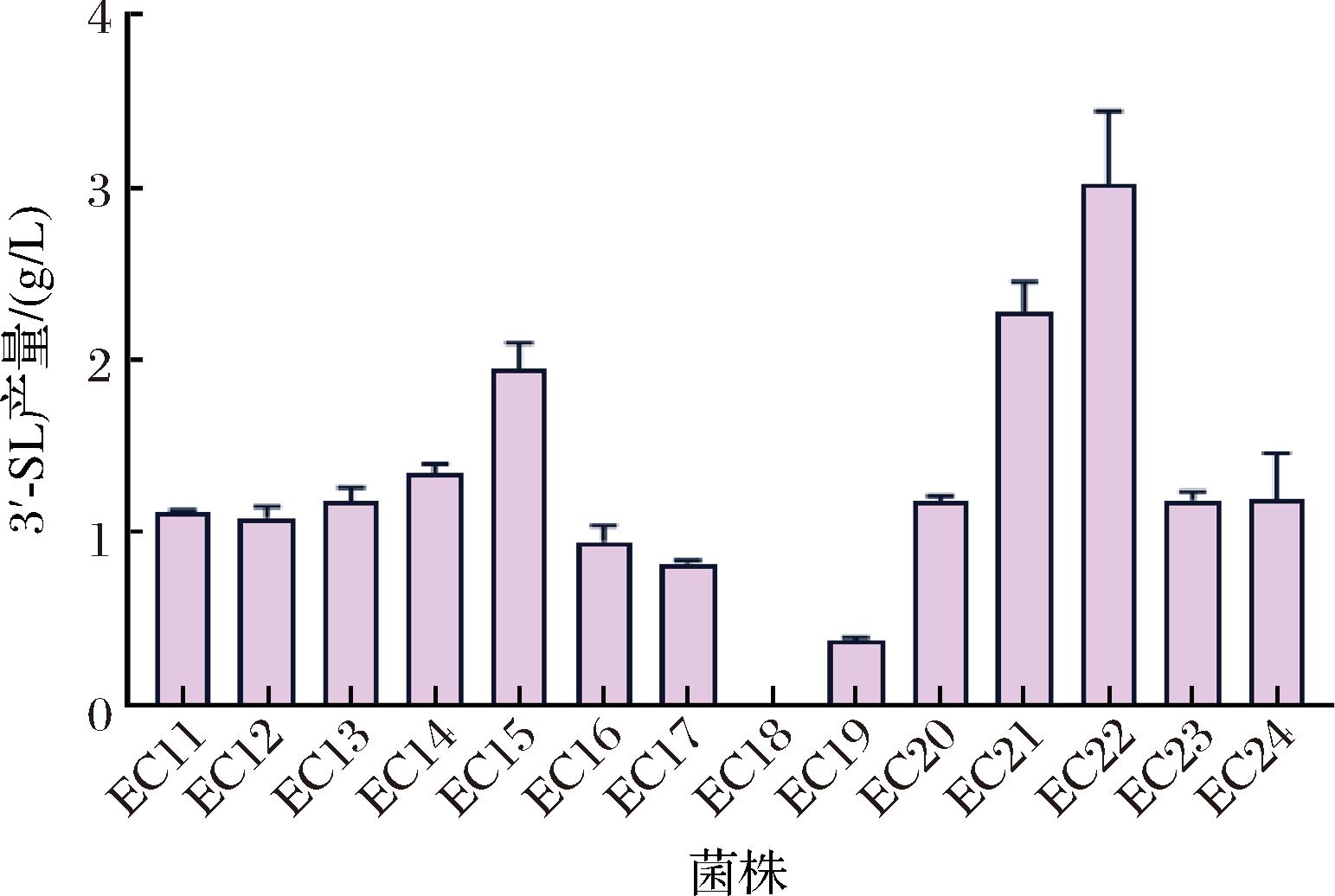 细胞内3′-SL检测操作流程如下:首先将发酵液样品OD600值稀释到5左右,取1 mL在12 000 r/min离心10 min收集菌体,弃上清液后加入等体积超纯水重悬菌体,重复离心-重悬洗涤步骤2次。随后将洗涤后的菌体置于冰水浴超声破碎仪中(全程维持低温),设定功率300 W、工作2 s/间歇4 s的工作参数,破碎20 min至溶液澄清。最后将破碎液于12 000 r/min离心10 min,取上清液经0.22 μm滤膜过滤后装入液相进样瓶检测(最终检测结果需要乘以稀释倍数得到实际产物浓度)。