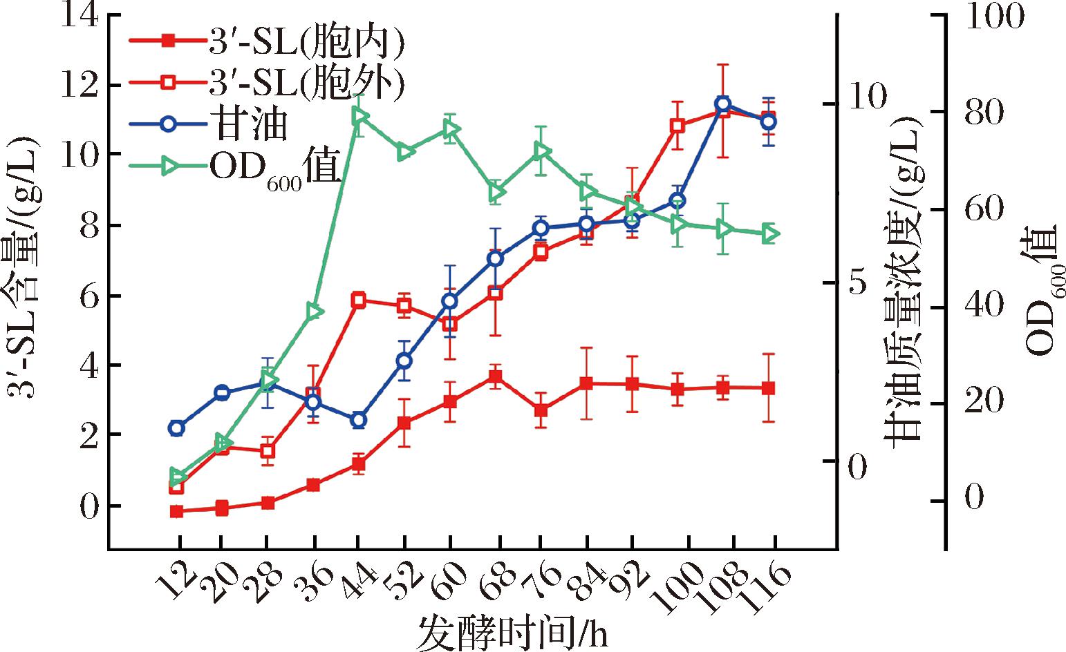 为了证明3′-SL菌株EC22的大规模生产潜力,本研究在3 L生物反应器中进行了间歇补料发酵(图6)。菌株EC22在培养28 h后快速生产3′-SL,108 h达到最高值,胞内加胞外的产量为14.85 g/L,比摇瓶培养增加了5倍,3′-SL的总生产强度为0.13 g/(L·h)。分析结果发现胞内3′-SL的累积量最高达到3.66 g/L,已有文献报道可以表达scrY,增加产物向胞外转运,说明3′-SL的生产效率仍有提高的空间,应进一步减少细胞内3′-SL在细胞内的积累,提高生产效率[18]。3 L生物反应器放大验证表明,本研究构建的无质粒且组成型表达关键基因的3′-SL合成菌株无需外源诱导即可实现菌体生长与产物合成的同步化。通过调控代谢通量平衡策略,成功维持菌株高效生产,使工程菌株在放大生产过程中展现出稳定的高效合成能力。