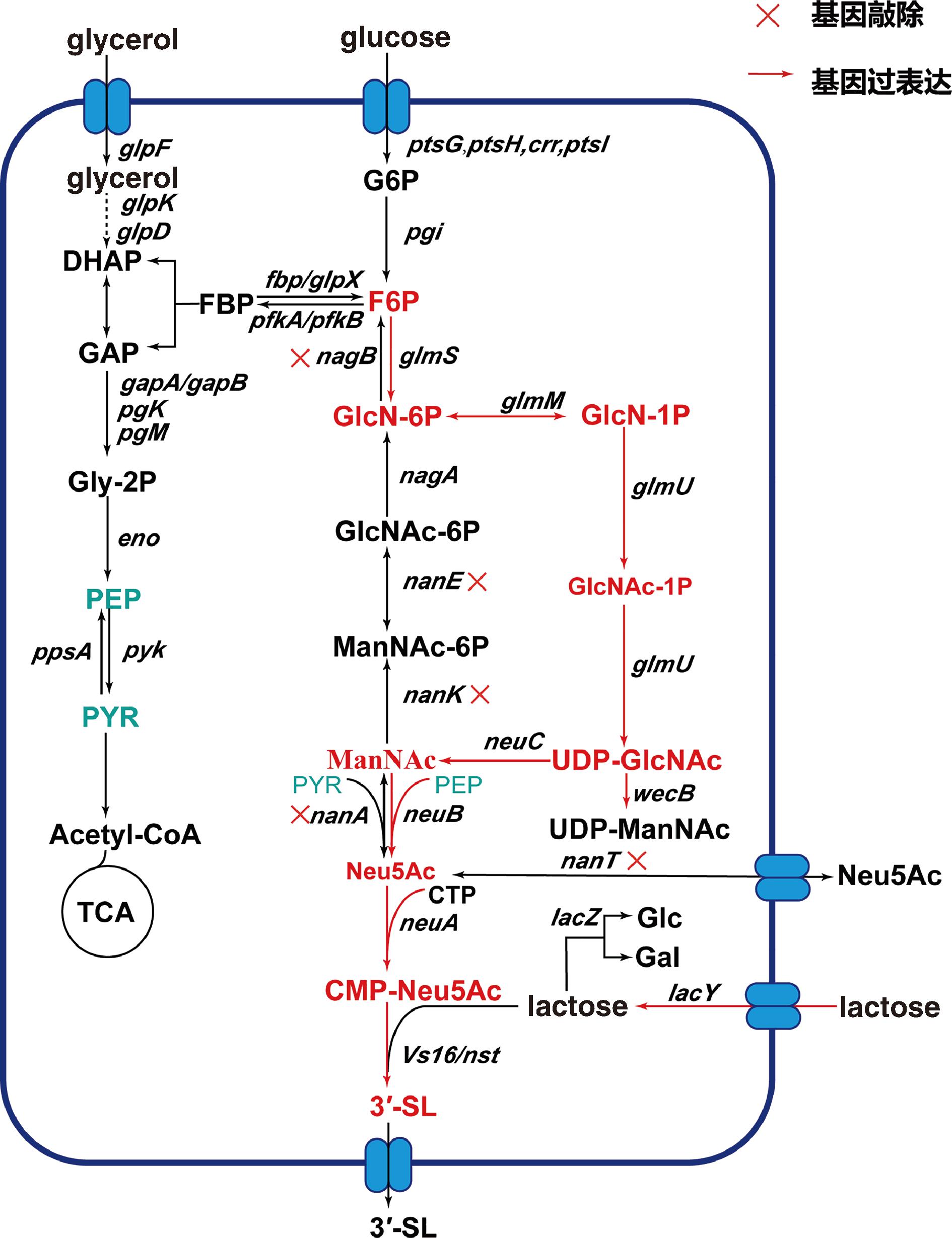 注:glycerol:甘油;glucose:葡萄糖;DHAP:二羟丙酮磷酸(dihydroxyacetone phosphate);GAP:甘油醛-3-磷酸(glyceraldehyde-3-phosphate);Gly-2P:甘油-2-磷酸(glycerol-2-phosphate);PEP:磷酸烯醇式丙酮酸(phosphoenolpyruvate);PYR:丙酮酸(pyruvate);acetyl-CoA:乙酰辅酶A(acetyl coenzyme A);G6P:葡萄糖-6-磷酸(glucose-6-phosphate);F6P:果糖-6-磷酸(fructose-6-phosphate);GlcN-6P:葡糖胺-6-磷酸(glucosamine-6-phosphate);GlcN-1P:葡糖胺-1-磷酸(glucosamine-1-phosphate);GlcNAc-6P:N-乙酰葡糖胺-6-磷酸(N-acetylglucosamine-6-phosphate);ManNAc-6P:N-乙酰甘露糖胺-6-磷酸(N-acetylmannosamine-6-phosphate);ManNAc:N-乙酰甘露糖胺(N-acetylmannosamine);CMP-Neu5Ac:胞苷单磷酸-N-乙酰神经氨酸(cytidine-monophosphate-Neu5Ac);Glc:葡萄糖(glucose);Gal:半乳糖(galactose);lactose:乳糖;UDP-ManNAc:尿苷二磷酸-N-乙酰甘露糖胺(uridine diphosphate-N-acetylmannosamine);CTP:胞苷三磷酸(cytidine triphosphate);TCA:三羧酸循环(tricarboxylic acid cycle);glpF:编码甘油转运蛋白;glpK:编码甘油激酶;glpD:编码甘油-3-磷酸脱氢酶;gapA/gapB:编码甘油醛-3-磷酸脱氢酶;pgK:编码磷酸甘油酸激酶;pgM:编码磷酸甘油酸变位酶;eno:编码烯醇化酶;ppsA:编码磷酸烯醇式丙酮酸合成酶;pyk:编码丙酮酸激酶;ptsG,ptsH,crr,ptsI:编码磷酸转移酶系统组分;pgi:编码磷酸葡萄糖异构酶;fbp/glpX:编码果糖-1,6-二磷酸酶;pfkA/pfkB:编码磷酸果糖激酶;nagB:编码氨基葡萄糖-6-磷酸异构酶/脱氢酶;glmS:编码葡糖胺-6-磷酸合成酶;glmM:编码葡糖胺-6-磷酸变位酶;glmU:编码葡糖胺-1-磷酸乙酰转移酶/尿苷酰转移酶;nagA:编码N-乙酰葡糖胺-6-磷酸脱乙酰酶;nanE:编码N-乙酰甘露糖胺-6-磷酸异构酶;nanK:编码N-乙酰甘露糖胺激酶;nanA:编码N-乙酰神经氨酸醛缩酶;nanT:编码N-乙酰神经氨酸转运蛋白;lacZ:编码β-半乳糖苷酶;lacY:编码乳糖通透酶;wecB:编码乙酰转移酶。