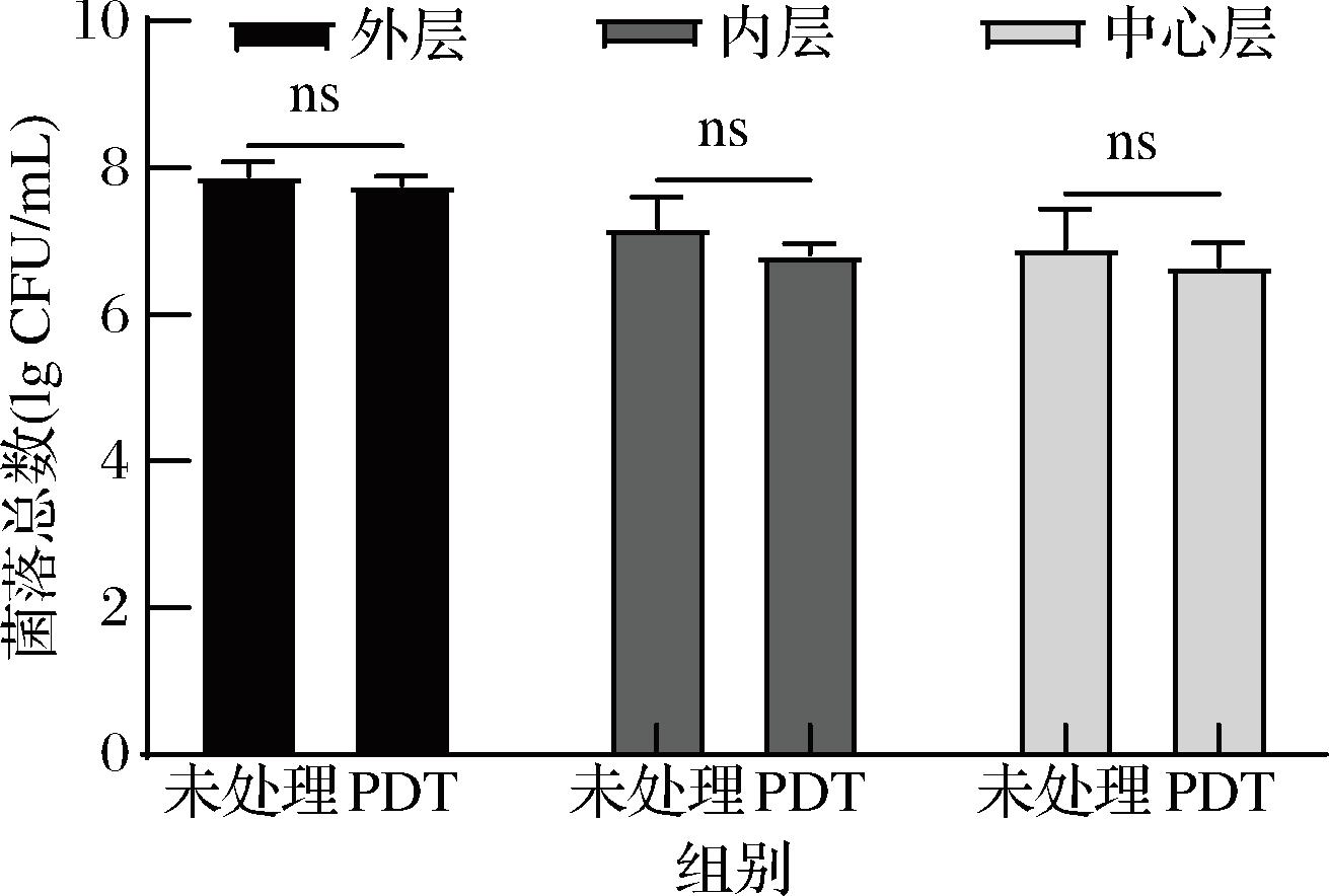 腐乳的菌含量由外而内呈现减少的趋势,外层菌含量最高,中心层最低(图5)。姜黄素浓度为250 μmol/L,光照剂量为125.95 J/cm2的PDT处理下,灭菌效果并不显著,最外层约灭活0.13 lg CFU/mL,内层灭活0.37 lg CFU/mL,中心层灭活0.25 lg CFU/mL,其灭菌效果远不如PDT在蜡样芽孢杆菌悬液中的灭活效果。其原因可能是姜黄素与细菌的接触以及光照强度受腐乳的粗糙表面影响,或需进一步优化姜黄素浓度和光照时间等参数设置,未来可借助其他非热杀菌技术协同增效。