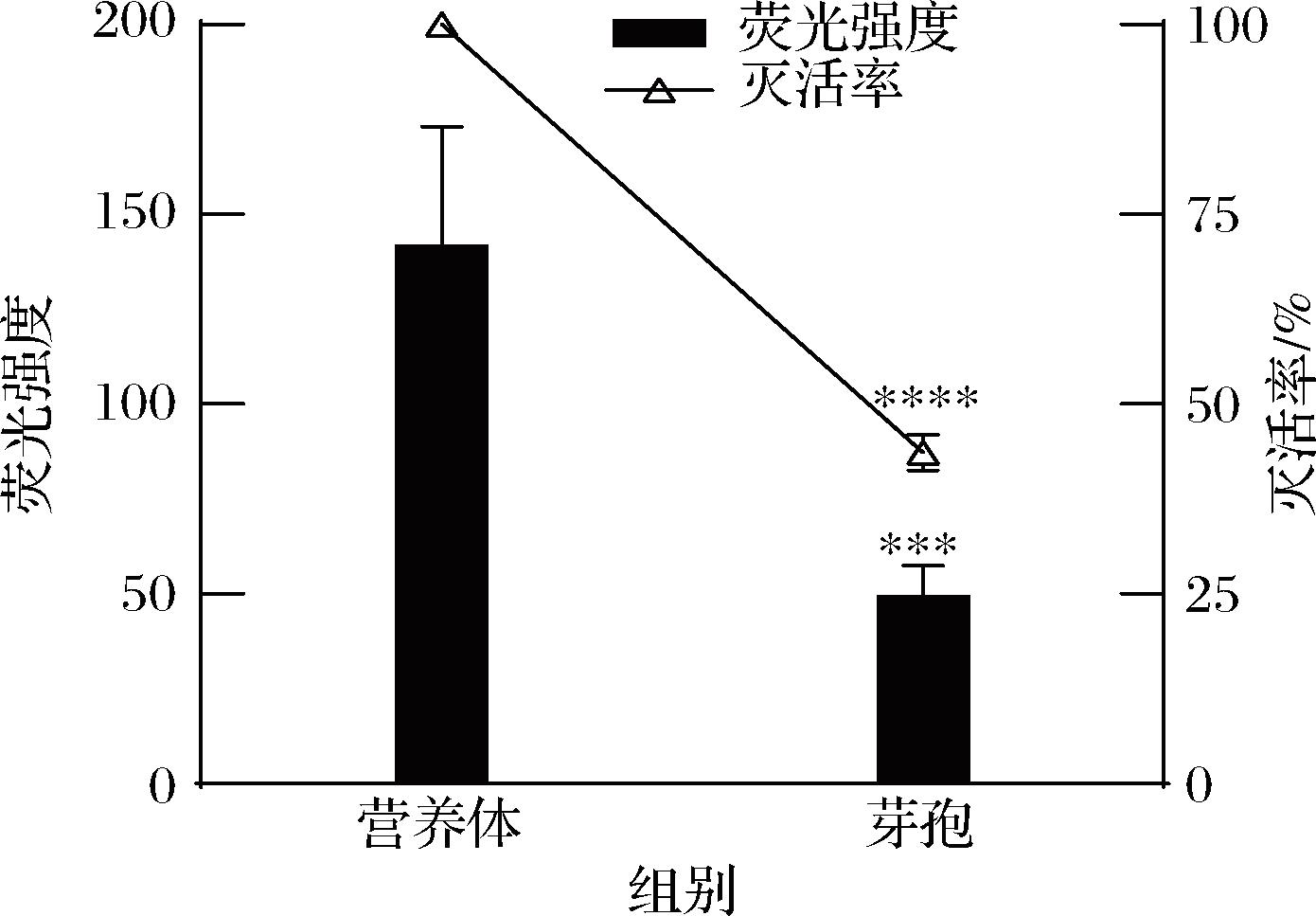 装载探针的营养体和芽孢悬液分别与250 μmol/L姜黄素溶液混匀,37 ℃避光孵育20 min,光照30 min。比较同等PDT条件下营养体和芽孢的灭活率,并采用酶标仪在488 nm/525 nm的激发和发射波长下测定荧光强度。