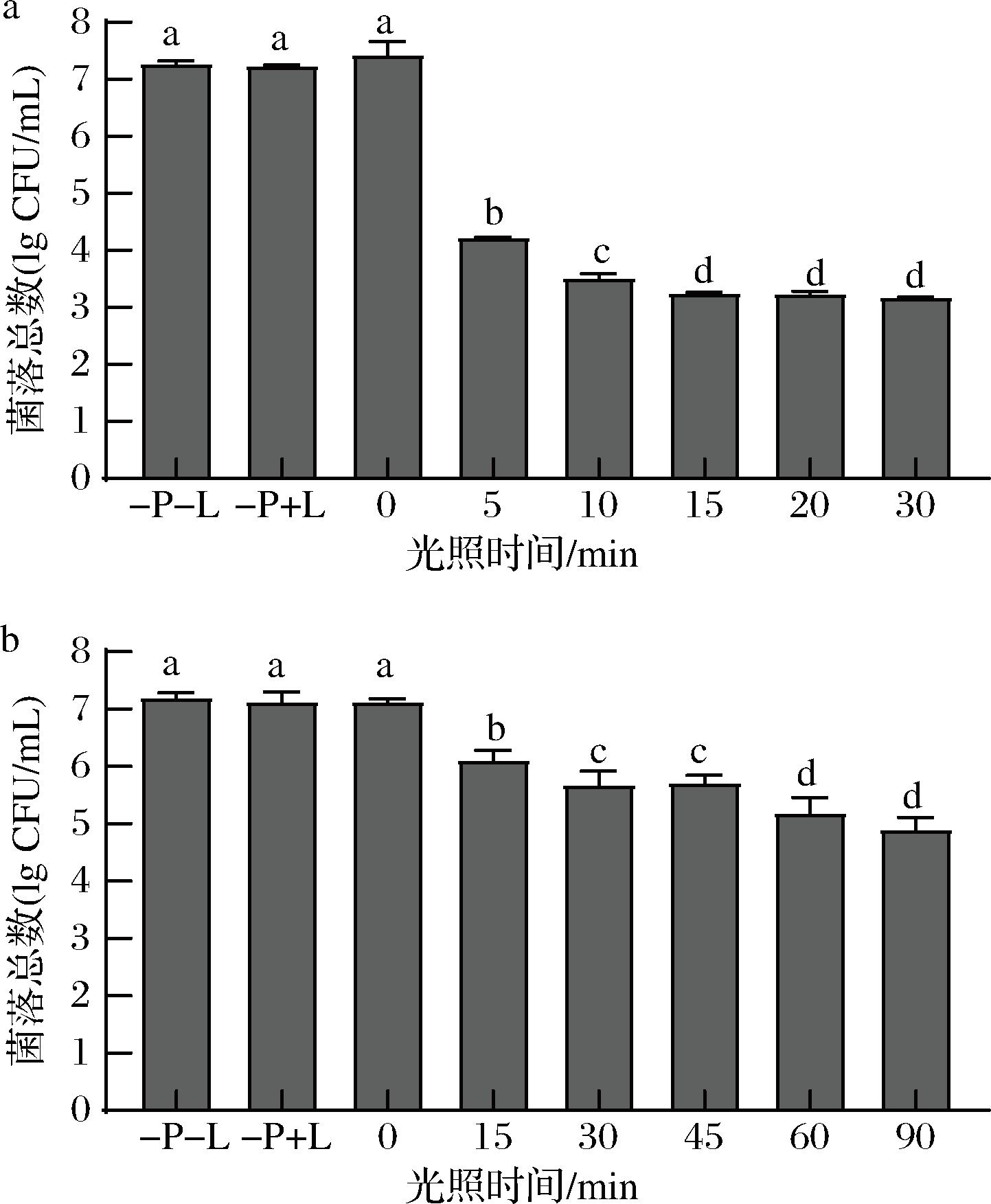 芽孢:1 mL芽孢与1 000 μmol/L姜黄素溶液等体积混匀,37 ℃暗孵育60 min,分别光照0、15、30、45、60、90 min。设置对照组-P-L(无姜黄素,不光照),-P+L(无姜黄素,光照90 min)。