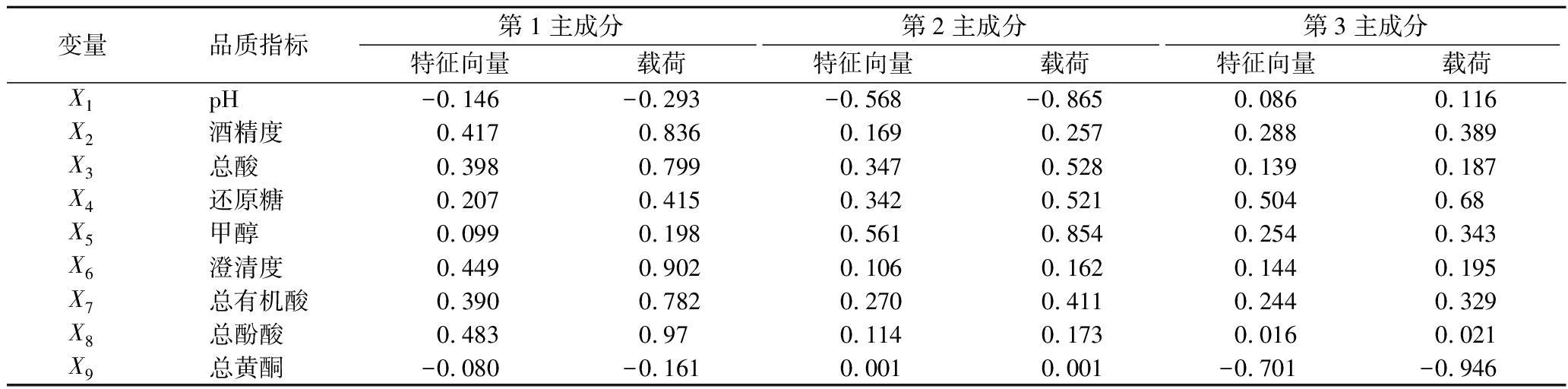 PCA是利用降维的思想,把多个独立的指标转化为几个综合指标(主成分)的多元统计方法,最终以几个主成分代替多个指标进行综合评价[31],是一种可以避免人为因素的干扰,广泛应用于食品品质的综合分析方法[32-33]。该方法为了综合评价5种果胶酶对骏枣果酒的品质影响,对总酸、还原糖、酒精度、澄清率、甲醇含量、pH、总有机酸、总黄酮和总酚酸物质共9个品质指标进行PCA。结果如表3所示,特征值大于1的主成分有3个,累计方差贡献率达到90.742%,能够全面反映骏枣果酒品质指标的信息。其中,PC1(44.742%)整合了澄清度、酒精度、总酸、有机酸及总酚酸,揭示果胶酶通过协同降解果胶主链、调控酸类代谢及释放酚类物质的核心作用;PC2(25.761%)关联甲醇含量与pH,反映甲醇生成与果胶酶类型密切相关,而pH变化则受有机酸和发酵副产物的双重调控,指向安全性及发酵环境稳定性;PC3(20.239%)以还原糖和总黄酮为核心,体现酶解对糖基释放及功能成分溶出的调控效应。
