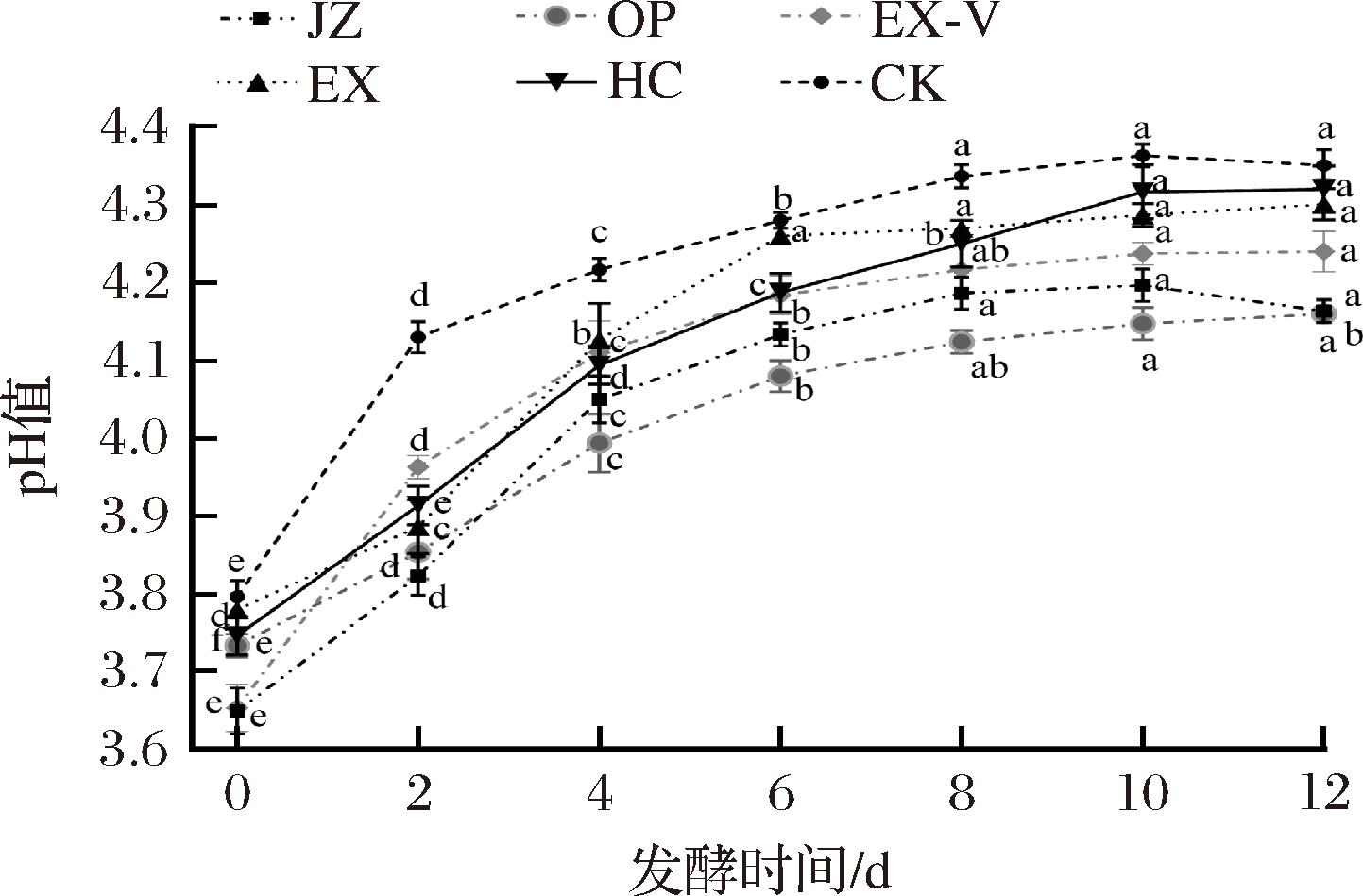 由图2可知,骏枣果酒发酵过程中pH呈现先上升后趋于平缓的趋势,果胶酶组的pH均显著低于CK,与总酸含量降低的结果相吻合。主要原因可能是果胶酶通过降解果胶释放的游离半乳糖醛酸被微生物进一步代谢。例如,酵母在酒精发酵过程中可能将部分有机酸转化为中性或弱碱性产物(如乳酸或乙醇),从而降低体系氢离子浓度[14]。研究表明,果胶酶处理可加速苹果酸-乳酸发酵,导致苹果酸含量下降和pH升高[17]。5种果胶酶处理组相比,HC组在发酵结束后的pH值(4.32)高于其他4个果胶酶组,其原因可能是该酶制剂中含有果胶酯酶,能够分解原料中的部分多糖,释放氨基糖类物质,中和部分酸性成分[18]。JZ组pH值在第10天达到最大(4.20),然而,随着发酵的进行,到12 d时,pH值降到4.16,说明该酶促进了一些碱性物质的降解同时又释放更多的有机酸,导致游离酸增加,这些酸的浓度不断升高会导致pH值下降[19]。