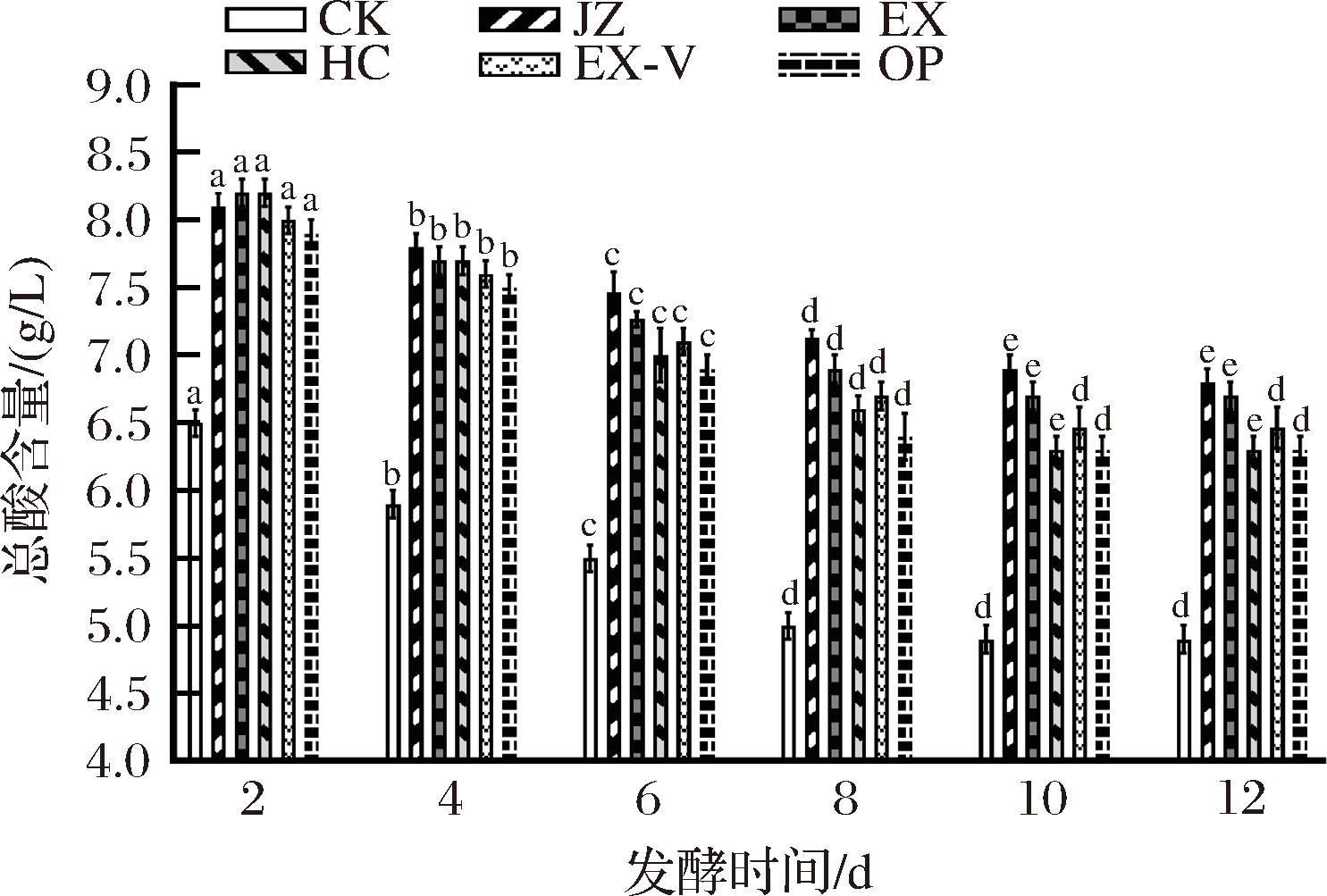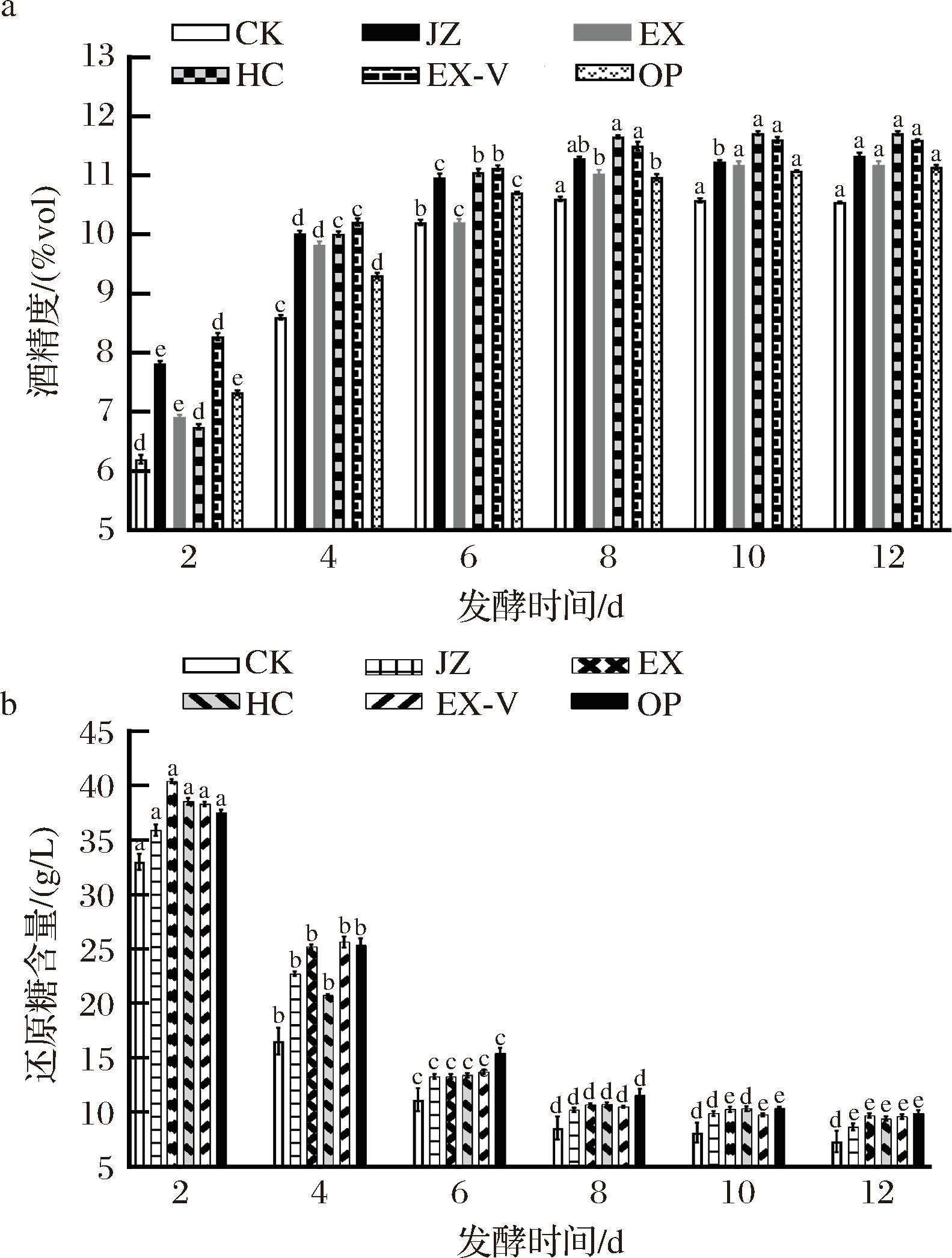由图3可知,骏枣果酒酒精度在发酵过程中呈先上升后趋于平缓的趋势,还原糖随着酒精发酵不断消耗呈先下降后趋于平缓趋势。主要原因是发酵前期,酵母菌通过糖酵解途径将葡萄糖、果糖等还原糖转化为丙酮酸,进而生成乙醇和CO2,在此阶段,酵母处于对数生长期,代谢活跃,还原糖被高效消耗,从而导致酒精度上升;发酵后期,发酵液中大部分还原糖被酵母消耗,维生素、矿物质及氮源缺乏导致酵母代谢受阻,因此,酒精度上升和还原糖下降都趋于稳定[20]。结果显示,各果胶酶组酒精度和还原糖含量显著高于CK组,此结果与钟思彦等[21]的研究结论一致。发酵12 d时,HC果胶酶组的酒精度最高,为11.72%vol,EX-V组的酒精度次之,为11.60%vol。OP组在发酵结束时还原糖含量(9.93 g/L)最高,但酒精度(11.14%vol)最低,这与WEI等[22]研究得出消耗糖越多得到的酒精度越高的结果一致。不同果胶酶由于水解果胶物质的能力不同,能供给酵母菌繁殖的营养成分有差异,导致酵母的发酵能力以及酒精度提升进程有所不同。
