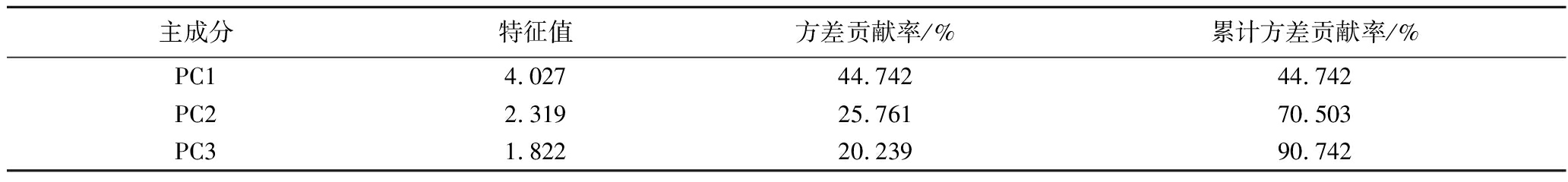主成分特征值方差贡献率/%累计方差贡献率/%PC14.02744.74244.742PC22.31925.76170.503PC31.82220.23990.742