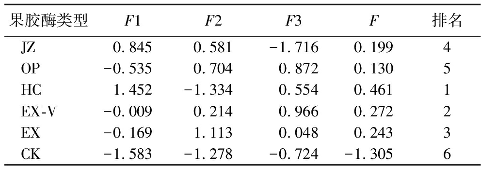 果胶酶类型F1F2F3F排名JZ0.8450.581-1.7160.1994OP-0.5350.7040.8720.1305HC1.452-1.3340.5540.4611EX-V-0.0090.2140.9660.2722EX-0.1691.1130.0480.2433CK-1.583-1.278-0.724-1.3056