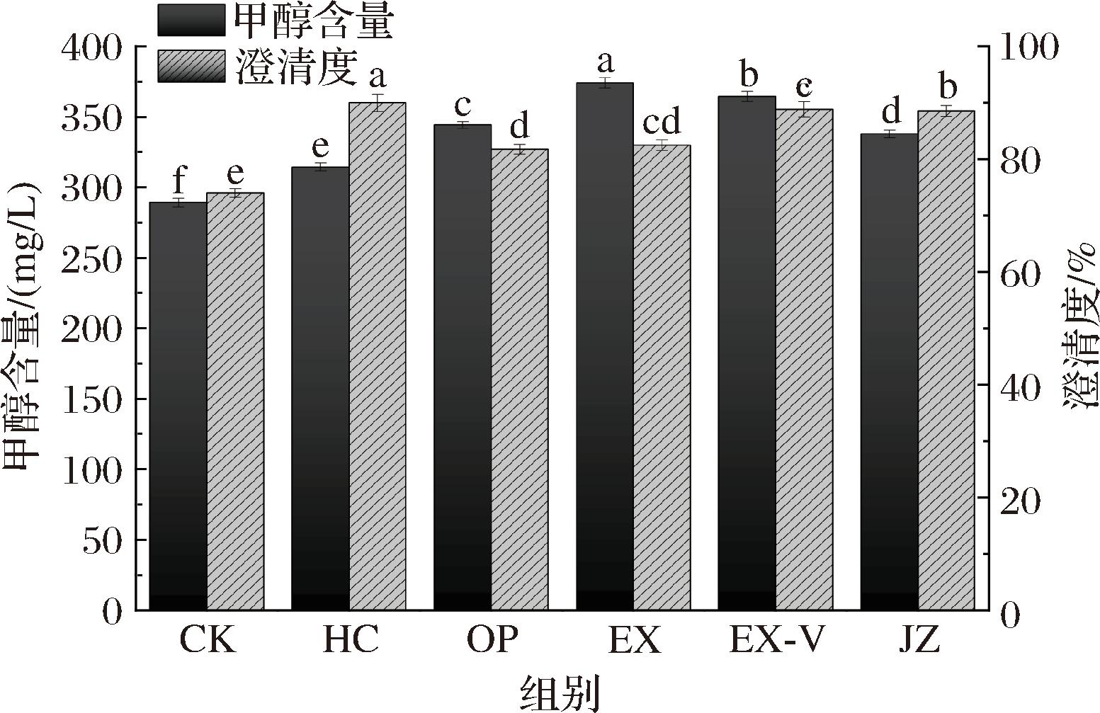 图4 不同果胶酶处理对骏枣果酒甲醇和澄清度的影响