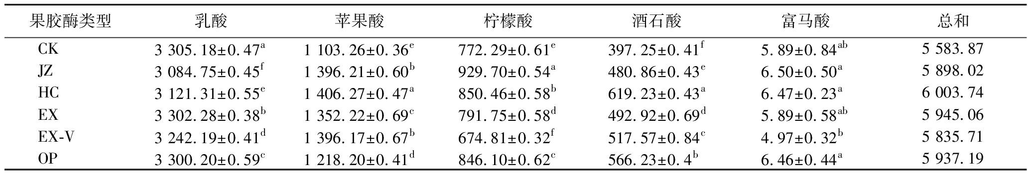 果胶酶类型乳酸苹果酸柠檬酸酒石酸富马酸总和CK3 305.18±0.47a1 103.26±0.36e772.29±0.61e397.25±0.41f5.89±0.84ab5 583.87JZ3 084.75±0.45f1 396.21±0.60b929.70±0.54a480.86±0.43e6.50±0.50a5 898.02HC3 121.31±0.55e1 406.27±0.47a850.46±0.58b619.23±0.43a6.47±0.23a6 003.74EX3 302.28±0.38b1 352.22±0.69c791.75±0.58d492.92±0.69d5.89±0.58ab5 945.06EX-V3 242.19±0.41d1 396.17±0.67b674.81±0.32f517.57±0.84c4.97±0.32b5 835.71OP3 300.20±0.59c1 218.20±0.41d846.10±0.62c566.23±0.4b6.46±0.44a5 937.19