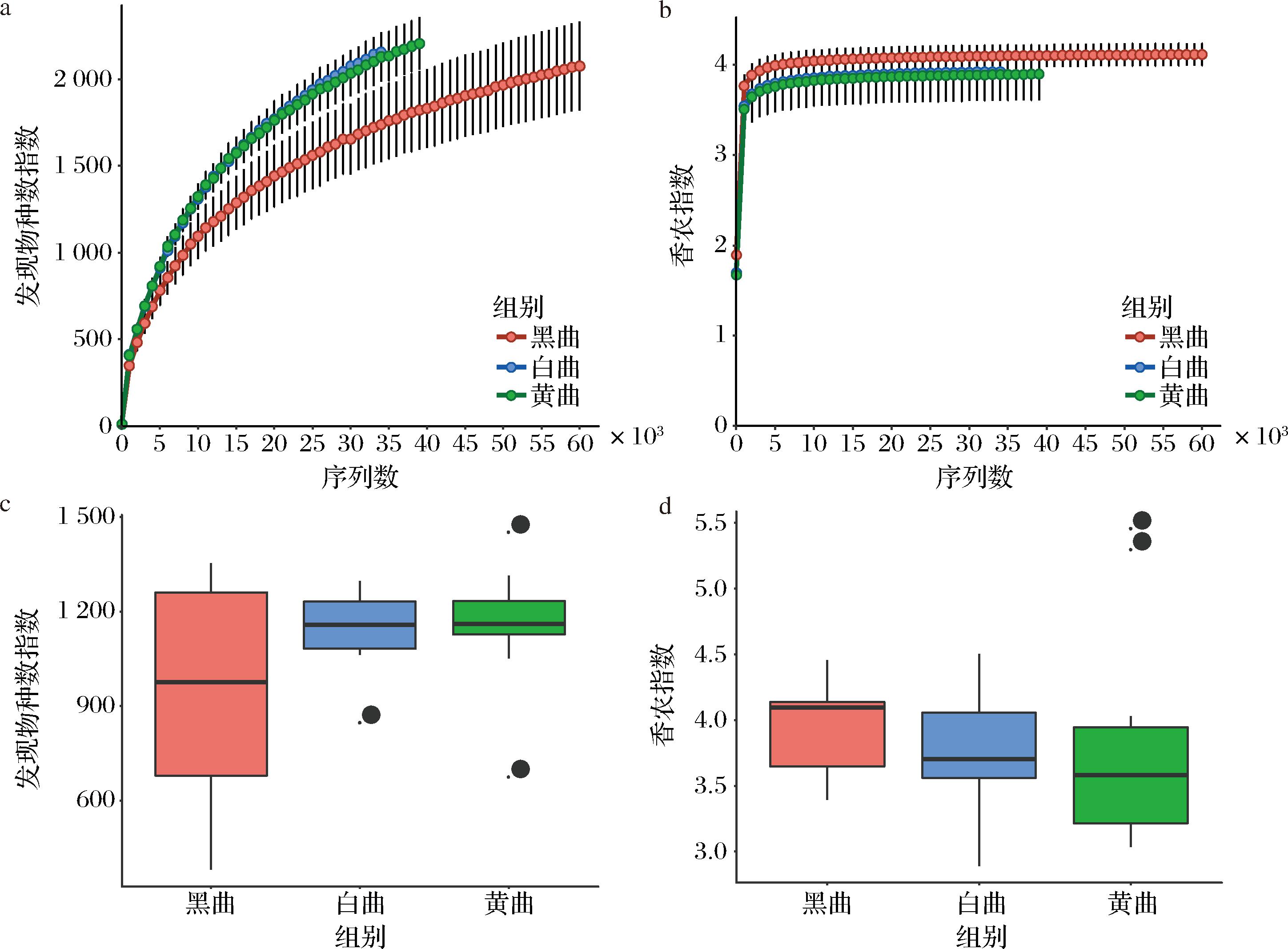 a-样品中真菌发现物种数指数曲线;b-为样品中真菌香农指数曲线;c-不同颜色大曲发现物种数指数箱形图;d-不同颜色大曲香浓指数箱形图
