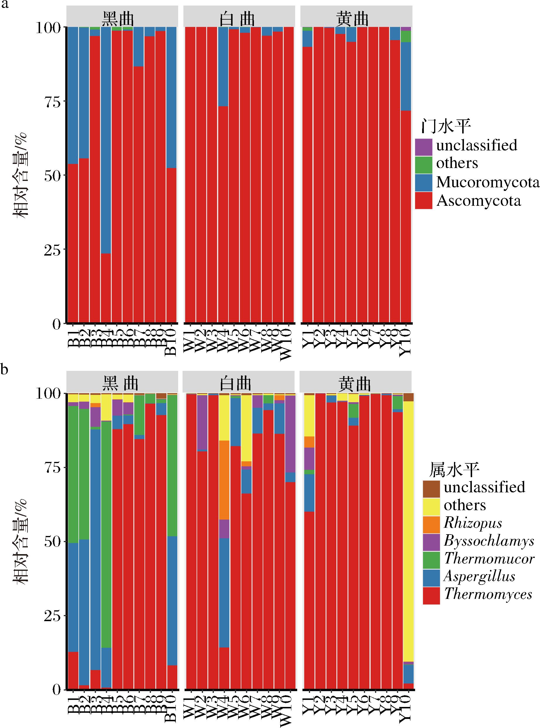 注:图中“unclassified”表示在相应分类学地位水平,无法明确这些微生物的具体分类学地位;“others”代表所有样品中除“unclassified”外,平均相对含量小于1%的所有微生物类群。其中门水平,“other”分类中主要包含的菌门为Basidiomycota、Mortierellomycota等;属水平,“others”分类中主要包含的菌属为Rhizomucor、Penicillium、Alternaria和Pichia等。
