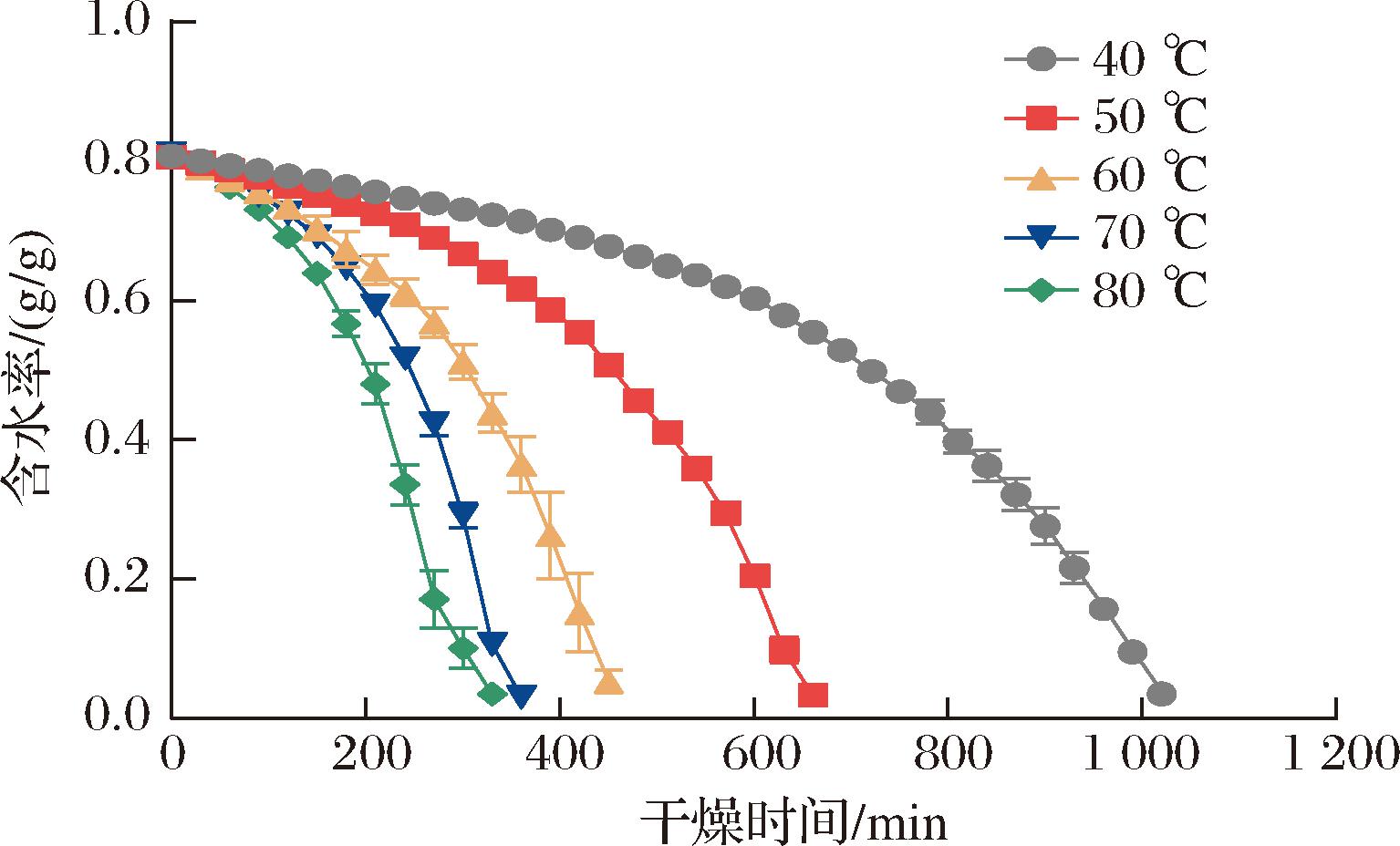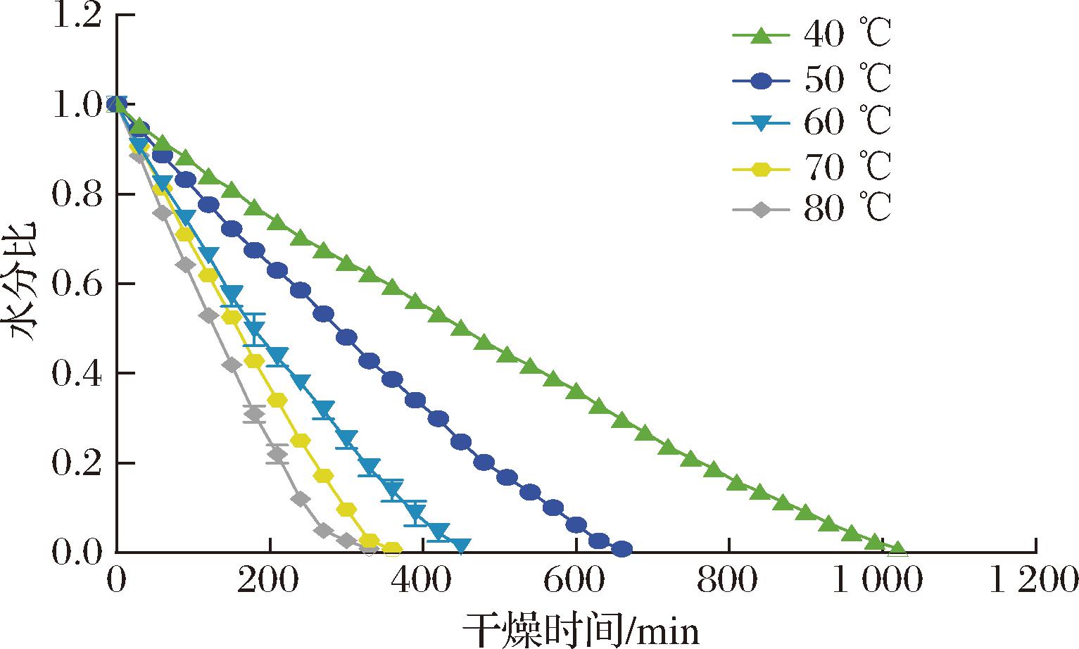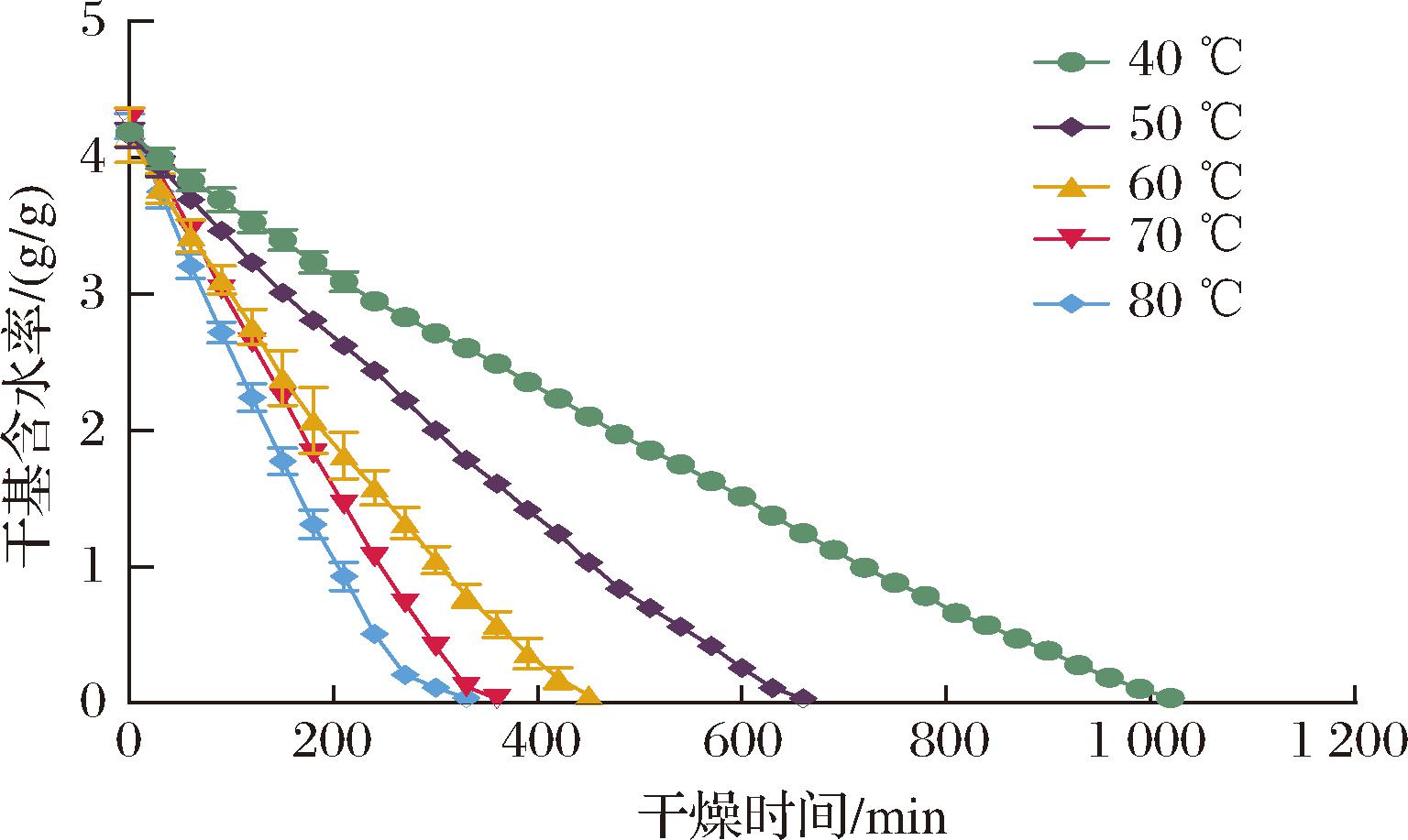 不同物料温度下干巴菌的干基含水率随干燥时间的变化曲线如图2所示。随着干燥时间不断延长,干巴菌的干基含水率持续降低,呈现出稳步下降的趋势。可以明显观察到,干燥温度越高,干巴菌的干燥曲线斜率越大,愈发陡峭,且达到干燥终点所需的时间越短。在干燥温度分别为40、50、60、70、80 ℃时,干巴菌干燥时间分别为1 050、690、480、390、360 min。