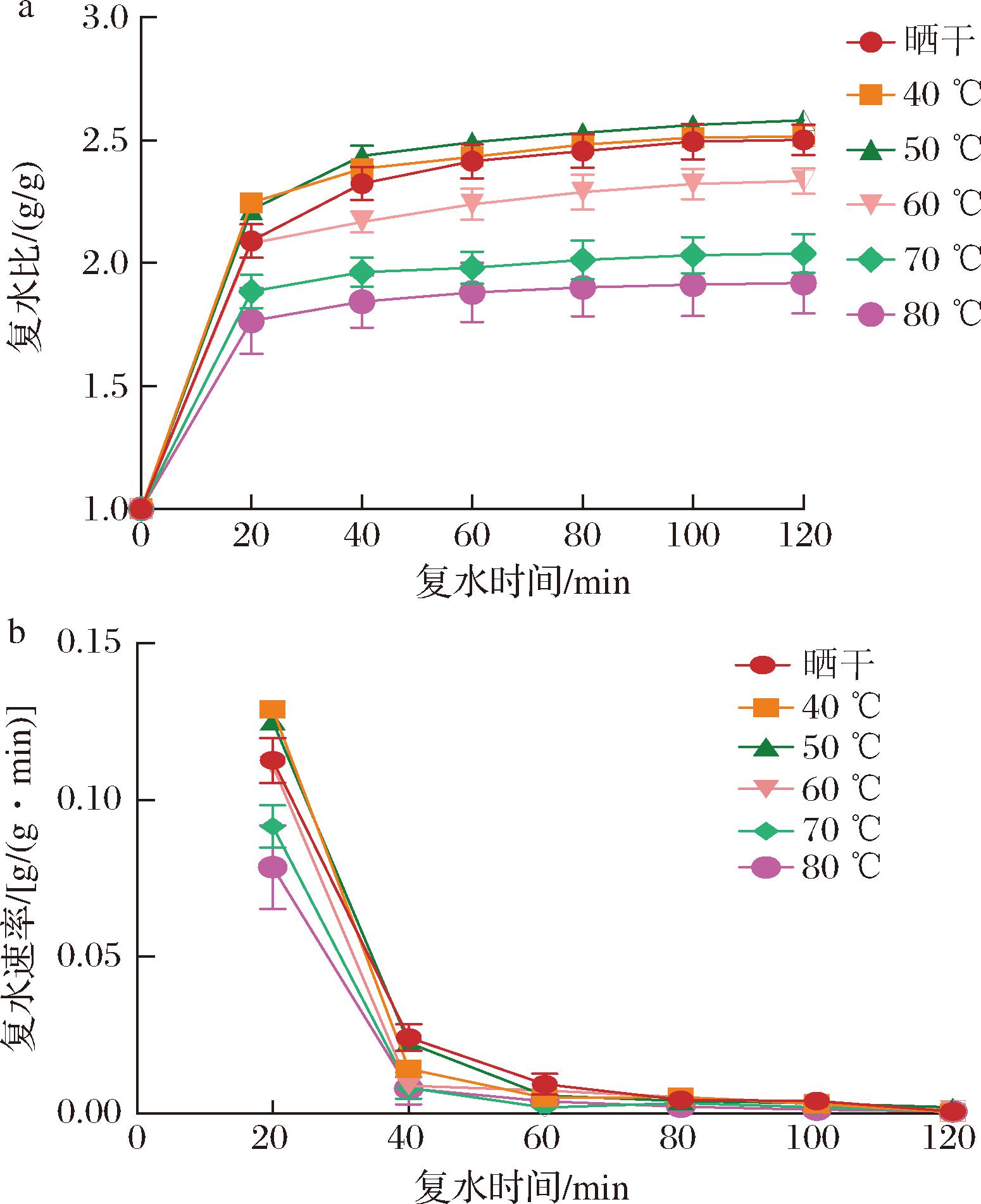 不同干燥方式下干巴菌的复水特性如图5所示。由图5-a可知,干巴菌的复水比大小为50 ℃>40 ℃>晒干>60 ℃>70 ℃>80 ℃,在复水初始的20 min内,干巴菌的复水比值迅速攀升,随后上升速度逐渐放缓,甚至趋于平稳,50 ℃真空干燥处理的干巴菌最终复水比最高。如图5-b所示,复水20 min时40 ℃组的干巴菌复水速率最高,80 ℃组的复水速率最低,其他组的复水速率接近。随着复水时间的延长复水速率降低。在较低的干燥温度(40、50 ℃)下,干巴菌的水分蒸发速率相对较慢,细胞结构损伤较少。因此干巴菌能够保持较多的孔隙结构,这有利于复水过程。当真空干燥的温度大于60 ℃,随着干燥温度升高,复水比值越低,可能是高温导致干巴菌的结构变化大,收缩率高,孔隙率低,复水性差[23]。当温度进一步提高到80 ℃,高温会加速细胞壁和细胞膜的破坏,细胞结构一旦损伤,细胞内的水分更易在干燥过程中丧失,同时,这种结构的损坏会降低细胞复水时的水分吸收能力。