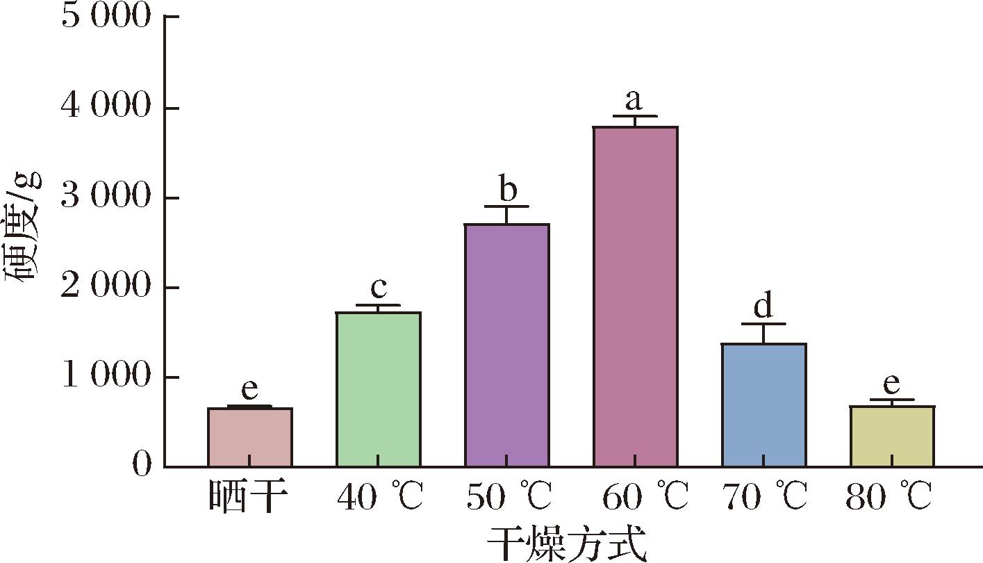 不同干燥方式下干巴菌的硬度如图6所示。通过比较不同干燥方式下干巴菌的硬度值,可以为最佳干燥方式的确定提供参考。在真空干燥中,随着干燥温度的提升,干巴菌硬度呈现出先上升后下降的趋势,60 ℃真空干燥样品硬度最大且显著高于其他组(P<0.05),其次是50 ℃真空干燥组。真空干燥的干巴菌硬度值远高于自然晒干的干巴菌硬度值,温度达到80 ℃时,干巴菌的硬度值与自然晒干之间无显著差异。