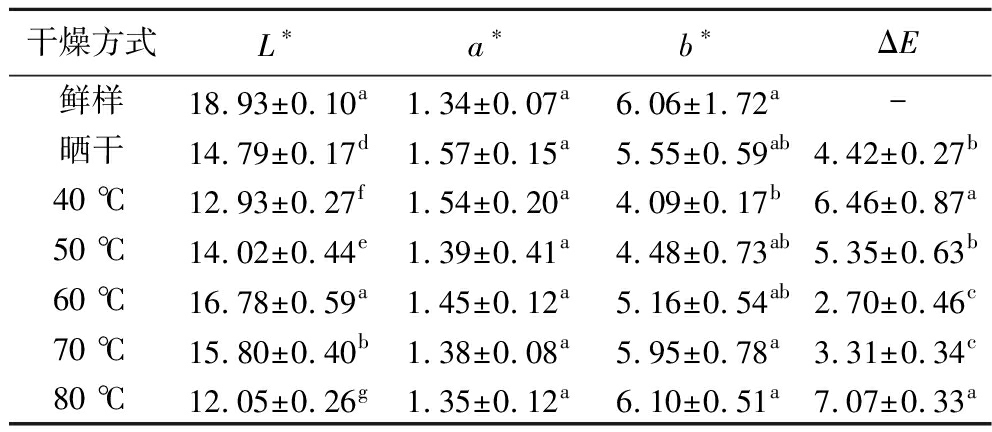 干燥方式L∗a∗b∗ΔE鲜样18.93±0.10a1.34±0.07a6.06±1.72a-晒干14.79±0.17d1.57±0.15a5.55±0.59ab4.42±0.27b40 ℃12.93±0.27f1.54±0.20a4.09±0.17b6.46±0.87a50 ℃14.02±0.44e1.39±0.41a4.48±0.73ab5.35±0.63b60 ℃16.78±0.59a1.45±0.12a5.16±0.54ab2.70±0.46c70 ℃15.80±0.40b1.38±0.08a5.95±0.78a3.31±0.34c80 ℃12.05±0.26g1.35±0.12a6.10±0.51a7.07±0.33a