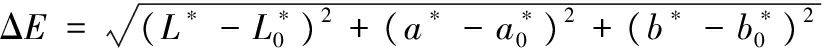 用测色色差计进行测定:L*值(亮度),其值从0到100变化,0表示黑色,100表示白色,值越大表示色泽越亮。a*值(红色度),表示从红到绿的值,100为红色,-80为绿色。b*值(黄色度),表示从黄色到蓝色的值,100为黄色,-80为蓝色。每种样品取3个样,每样旋转3次不同角度分别读数,取读数的平均值。色差值ΔE计算如公式(6)所示[19]: