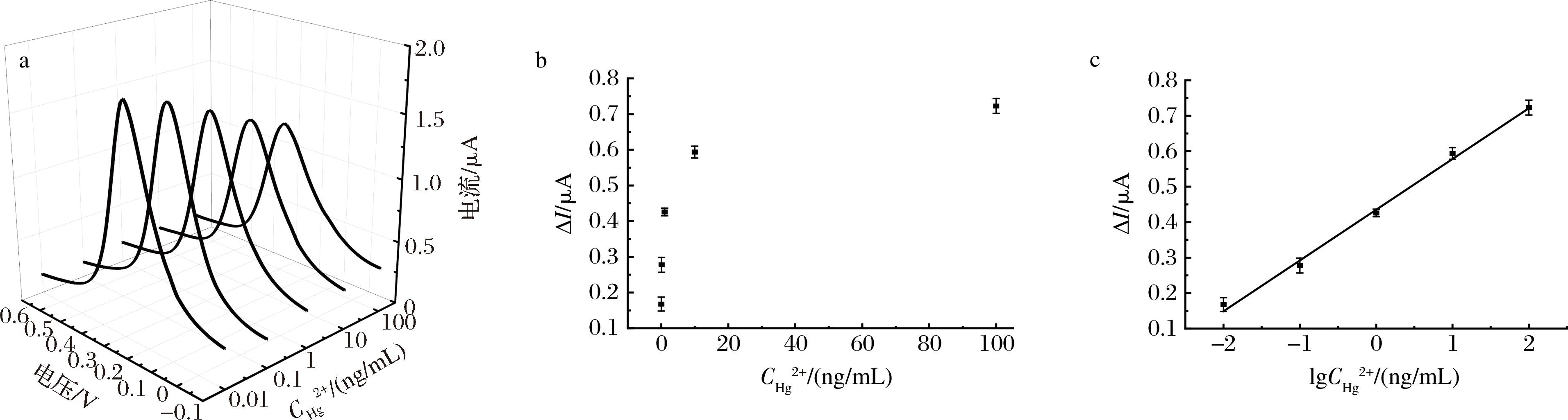 分别考察了30、45、60、75、90 min这5个识别反应时间对电化学信号的影响。如图5-c所示,随着时间从30 min延长到60 min,ΔI也呈现上升趋势,并在60 min时ΔI趋于稳定,与文献报道的Hg2+识别反应时间50 min较为接近[13]。因此,确定最佳的识别时间为60 min。