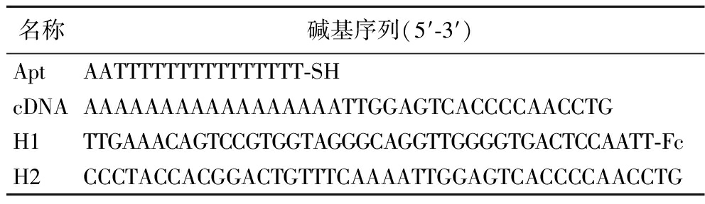 名称碱基序列(5′-3′)AptAATTTTTTTTTTTTTTT-SHcDNAAAAAAAAAAAAAAAAAATTGGAGTCACCCCAACCTGH1TTGAAACAGTCCGTGGTAGGGCAGGTTGGGGTGACTCCAATT-FcH2CCCTACCACGGACTGTTTCAAAATTGGAGTCACCCCAACCTG