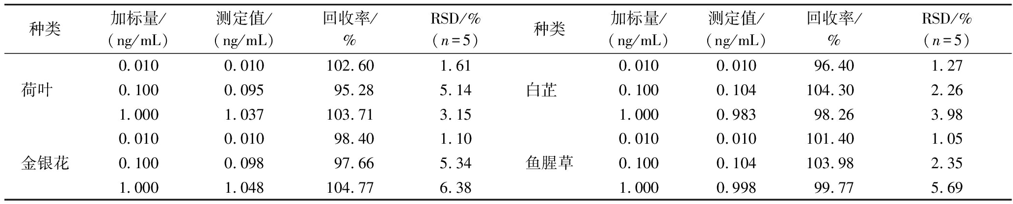 种类加标量/(ng/mL)测定值/(ng/mL)回收率/%RSD/%(n=5)种类加标量/(ng/mL)测定值/(ng/mL)回收率/%RSD/%(n=5)0.0100.010102.601.610.0100.01096.401.27荷叶 0.1000.09595.285.14白芷 0.1000.104104.302.261.0001.037103.713.151.0000.98398.263.980.0100.01098.401.100.0100.010101.401.05金银花0.1000.09897.665.34鱼腥草0.1000.104103.982.351.0001.048104.776.381.0000.99899.775.69