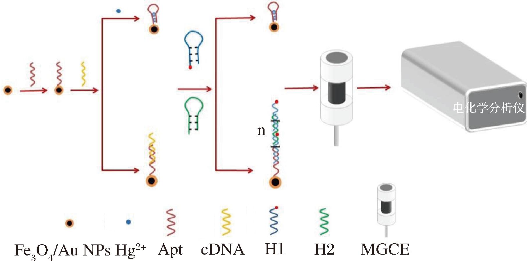 金磁纳米粒子是一种复合纳米材料,以Fe3O4磁性颗粒为内核,表面包覆金纳米层,具有优异的超顺磁特性和生物相容性,能够在外加磁场作用下,实现快速分离,在复杂样品检测中展现显著优势[10]。本研究以金磁纳米粒子为载体,固定Hg2+特异性识别适配体探针(aptamer,Apt),构建基于HCR的电化学传感检测方法对荷叶、金银花、白芷、鱼腥草4种典型的药食同源食品中Hg2+进行测定。