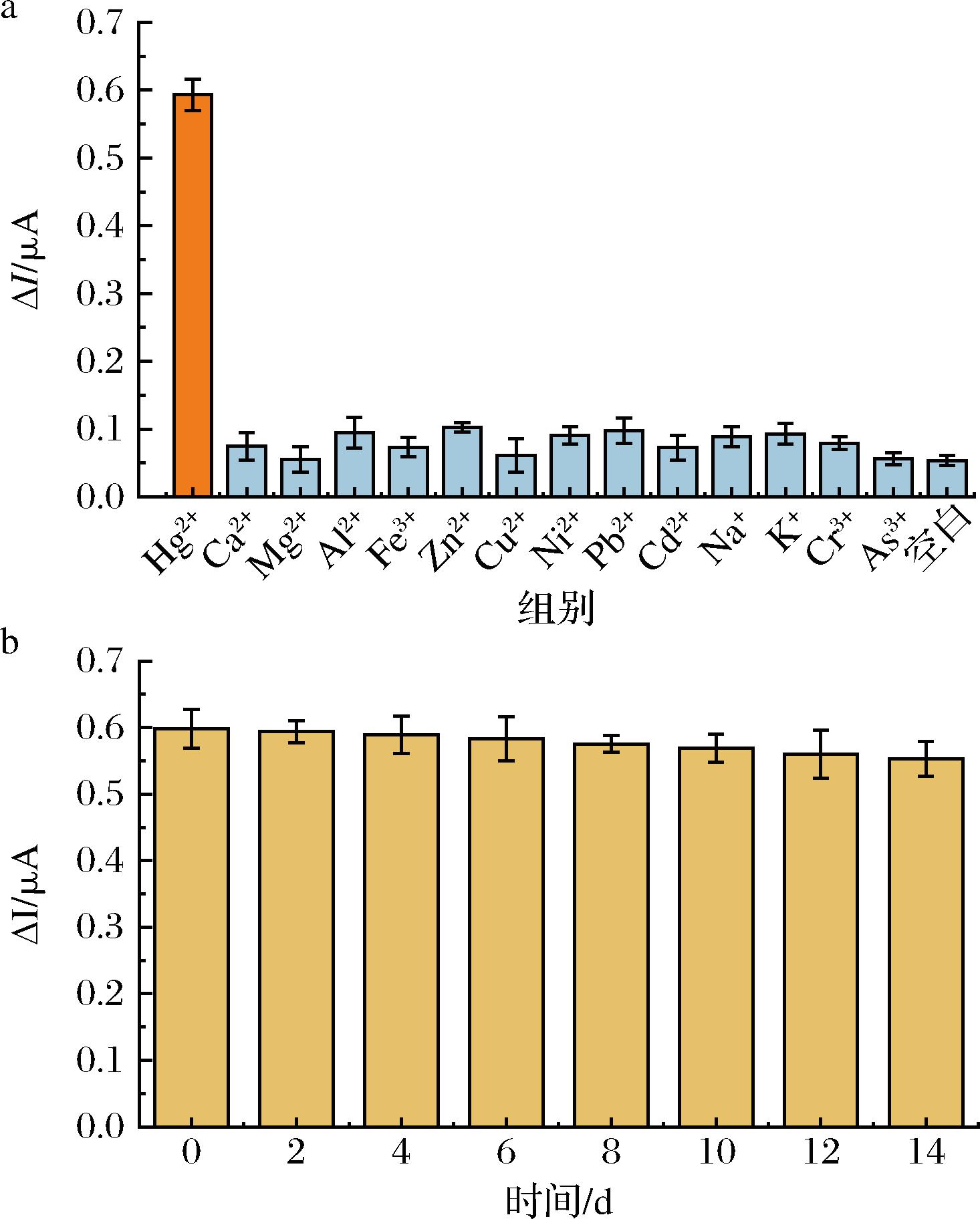 为探究本方法的特异性,选取10 ng/mL的Ca2+、Mg2+、Al3+、Fe3+、Zn2+、Cu2+、Ni2+、Pb2+、Cd2+、Na+、K+、Cr3+、As3+为干扰离子,与1 ng/mL Hg2+和未添加任何干扰离子的空白样进行比较,分别测定其ΔI值。如图7-a所示,只有Hg2+存在时,ΔI值才会出现显著变化,其他干扰离子存在时的ΔI值与空白样的ΔI值相差不大。这是主要是由于Apt中的T能够通过N-Hg2+配位作用,特异性识别Hg2+形成稳定的T-Hg2+-T结构,确保方法良好的抗干扰性能。将同一批次制备的金磁-Apt探针置于4 ℃冰箱保存14 d,每隔1 d,加入1 ng/mL Hg2+进行反应,测定其ΔI值。图7-b结果显示14 d后,仍能保持其初始值的92.6%,说明金磁-Apt探针具有良好的稳定性。