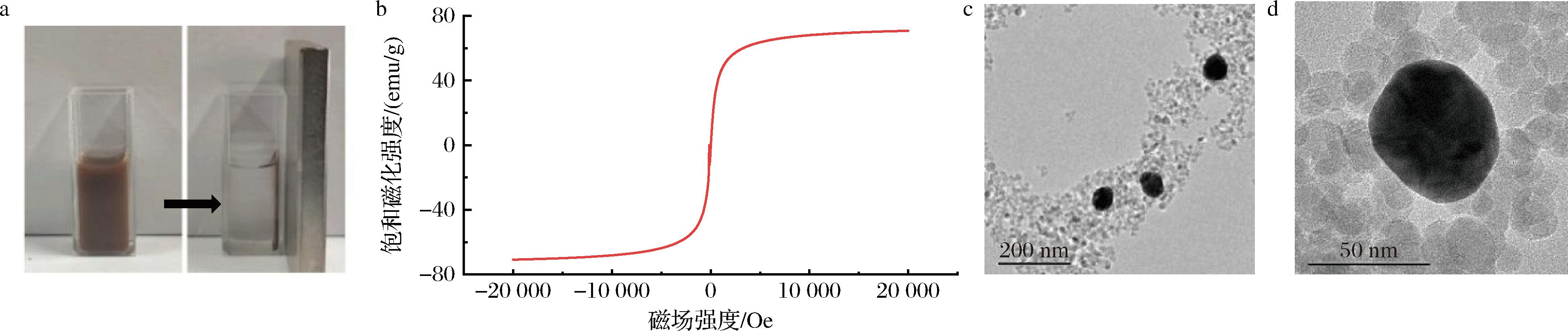 a-外加磁力吸附金磁纳米粒子;b-纳米粒子的磁响应力;c-Fe3O4/Au的透射电镜图(200 nm);d-Fe3O4/Au的透射电镜图(50 nm)