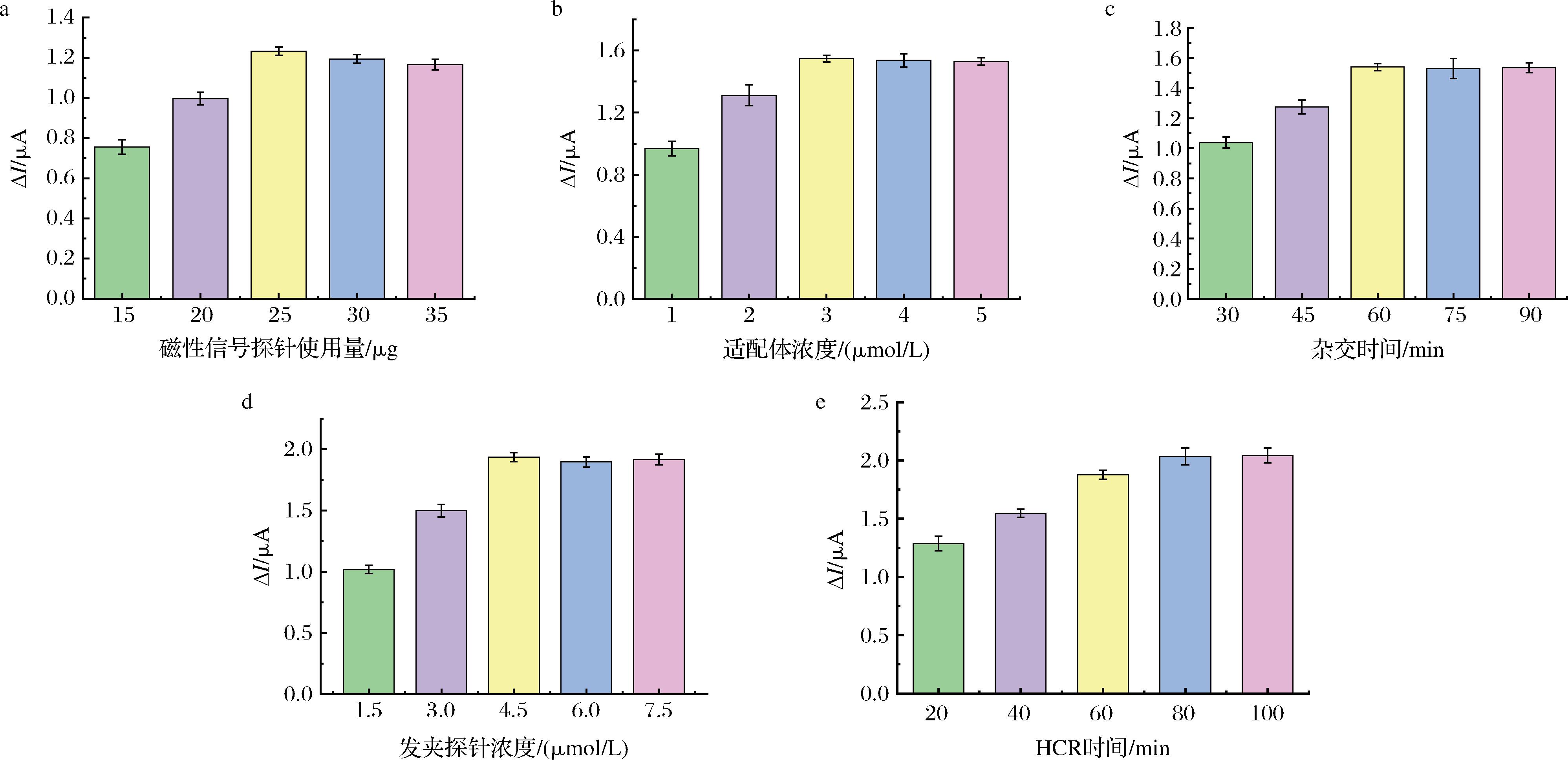 a-信号探针使用量;b-适配体浓度;c-杂交时间;d-发夹探针浓度;e-HCR时间