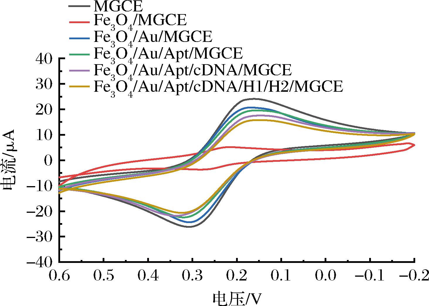 采用CV对金磁-Apt探针在电极表面的修饰情况进行表征。图4为不同电极在含5 mmol/L[Fe(CN)6]3-/4-的0.1 mol/L KCl溶液中的CV曲线。裸磁性玻碳电极CV曲线呈现