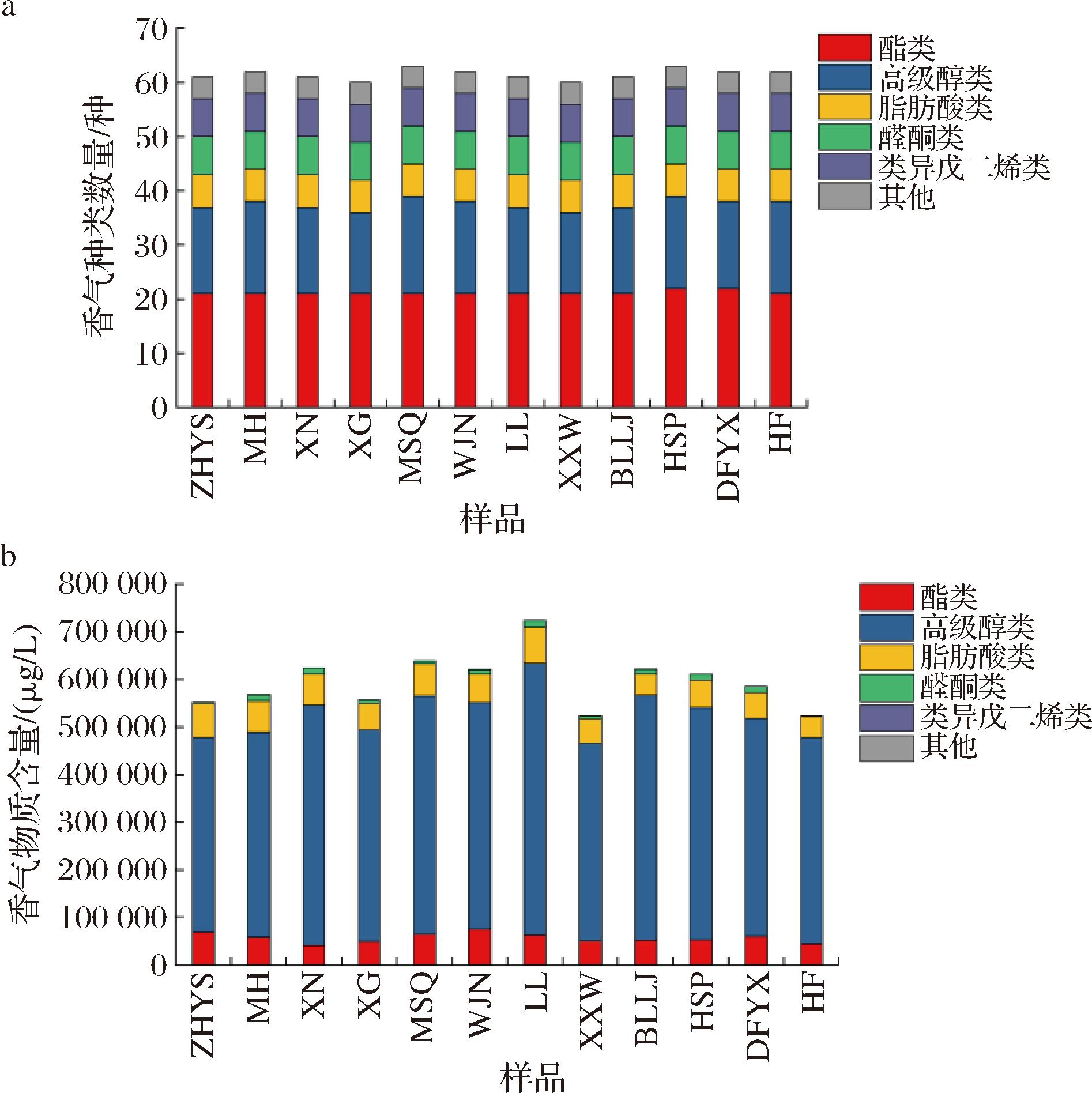 如图2所示,从12款酒样中共检测出64种挥发性成分,包括酯类22种、高级醇类18种、脂肪酸6种、醛酮类7种、类异戊二烯类7种、其他4种。其中,分别鉴定出ZHYS(61种)、MH(62种)、XN(60种)、XG(60种)、MSQ(63种)、WJN(62种)、LL(61种)、XXW(60种)、BLLJ(61种)、HSP(62种)、DFYX(62种)、HF(62种)挥发性成分,有58个共有成分。挥发性成分总量由高到低为:LL(724 462.31 μg/L)、MSQ(639 100.03 μg/L)、XN(624 058.31 μg/L)、BLLJ(621 151.52 μg/L)、WJN(620 250.03 μg/L)、HSP(610 444.86 μg/L)、DFYX(585 822.9 μg/L)、MH(568 562.29 μg/L)、XG(557 542.28 μg/L)、ZHYS(552 760.37 μg/L)、HF(524 435.16 μg/L)、XXW(524 185.11 μg/L)。不同葡萄园干红葡萄酒香气物质种类及含量存在差异,这与张文昊等[30]研究结果相似。