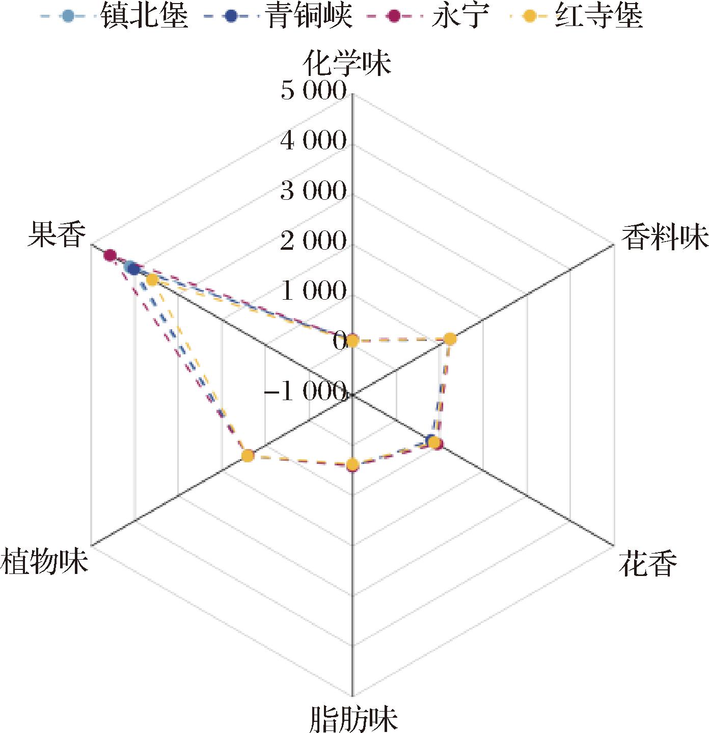 选取OAV>1的香气成分,根据其OAV加成值绘制香气轮廓图(图4)。将香气归类为化学味、香料、花香、脂肪味、植物味、果香六类,由于物质的复杂性部分物质属于2种类别。4个产区表现出不同的风格特点,以果香、植物味、香料和花香味突出,其次是化学味和脂肪味。果香加成值在各产区间存在显著性差异,以永宁产区(4 563.54)最高,其次是镇北堡产区(4 107.47)、青铜峡产区(4 013.79)、红寺堡产区(3 591.74);花香表现为永宁产区(944.02)最高,其次是镇北堡产区(915.43)、红寺堡产区(875.70)、青铜峡产区(799.01)。