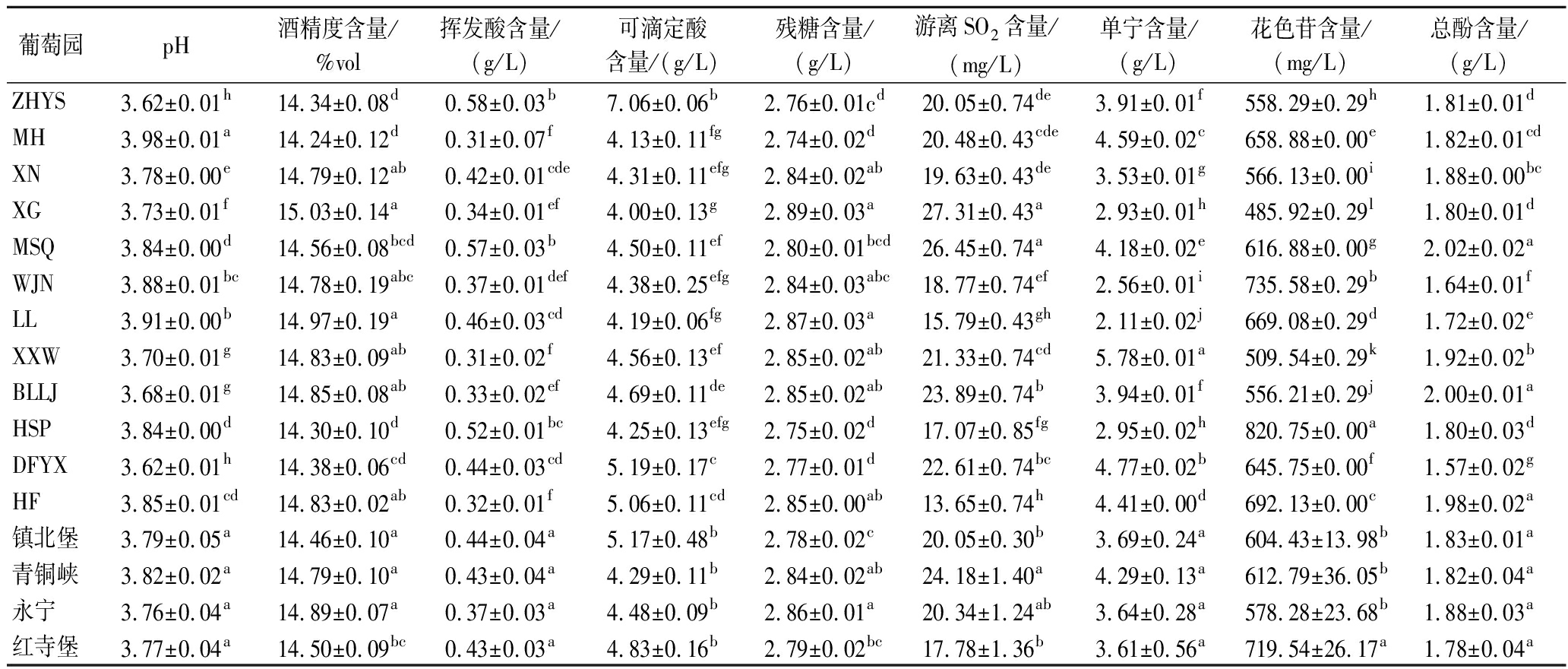 葡萄园pH酒精度含量/%vol挥发酸含量/(g/L)可滴定酸含量/(g/L)残糖含量/(g/L)游离SO2含量/(mg/L)单宁含量/(g/L)花色苷含量/(mg/L)总酚含量/(g/L)ZHYS3.62±0.01h14.34±0.08d0.58±0.03b7.06±0.06b2.76±0.01cd20.05±0.74de3.91±0.01f558.29±0.29h1.81±0.01dMH3.98±0.01a14.24±0.12d0.31±0.07f4.13±0.11fg2.74±0.02d20.48±0.43cde4.59±0.02c658.88±0.00e1.82±0.01cdXN3.78±0.00e14.79±0.12ab0.42±0.01cde4.31±0.11efg2.84±0.02ab19.63±0.43de3.53±0.01g566.13±0.00i1.88±0.00bcXG3.73±0.01f15.03±0.14a0.34±0.01ef4.00±0.13g2.89±0.03a27.31±0.43a2.93±0.01h485.92±0.29l1.80±0.01dMSQ3.84±0.00d14.56±0.08bcd0.57±0.03b4.50±0.11ef2.80±0.01bcd26.45±0.74a4.18±0.02e616.88±0.00g2.02±0.02aWJN3.88±0.01bc14.78±0.19abc0.37±0.01def4.38±0.25efg2.84±0.03abc18.77±0.74ef2.56±0.01i735.58±0.29b1.64±0.01fLL3.91±0.00b14.97±0.19a0.46±0.03cd4.19±0.06fg2.87±0.03a15.79±0.43gh2.11±0.02j669.08±0.29d1.72±0.02eXXW3.70±0.01g14.83±0.09ab0.31±0.02f4.56±0.13ef2.85±0.02ab21.33±0.74cd5.78±0.01a509.54±0.29k1.92±0.02bBLLJ3.68±0.01g14.85±0.08ab0.33±0.02ef4.69±0.11de2.85±0.02ab23.89±0.74b3.94±0.01f556.21±0.29j2.00±0.01aHSP3.84±0.00d14.30±0.10d0.52±0.01bc4.25±0.13efg2.75±0.02d17.07±0.85fg2.95±0.02h820.75±0.00a1.80±0.03dDFYX3.62±0.01h14.38±0.06cd0.44±0.03cd5.19±0.17c2.77±0.01d22.61±0.74bc4.77±0.02b645.75±0.00f1.57±0.02gHF3.85±0.01cd14.83±0.02ab0.32±0.01f5.06±0.11cd2.85±0.00ab13.65±0.74h4.41±0.00d692.13±0.00c1.98±0.02a镇北堡3.79±0.05a14.46±0.10a0.44±0.04a5.17±0.48b2.78±0.02c20.05±0.30b3.69±0.24a604.43±13.98b1.83±0.01a青铜峡3.82±0.02a14.79±0.10a0.43±0.04a4.29±0.11b2.84±0.02ab24.18±1.40a4.29±0.13a612.79±36.05b1.82±0.04a永宁3.76±0.04a14.89±0.07a0.37±0.03a4.48±0.09b2.86±0.01a20.34±1.24ab3.64±0.28a578.28±23.68b1.88±0.03a红寺堡3.77±0.04a14.50±0.09bc0.43±0.03a4.83±0.16b2.79±0.02bc17.78±1.36b3.61±0.56a719.54±26.17a1.78±0.04a