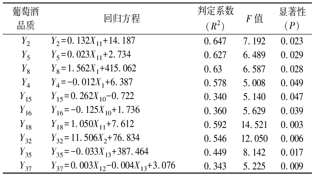 葡萄酒品质回归方程判定系数(R2)F值显著性(P)Y2Y2=0.132X11+14.1870.6477.1920.023Y5Y5=0.023X11+2.7340.6276.4890.029Y8Y8=1.562X1+415.0620.636.5870.028Y4Y4=-0.012X1+6.3870.5785.0080.049Y15Y15=0.262X10-0.7220.3405.1400.047Y16Y16=-0.125X10+1.7360.3605.6290.039Y18Y18=1.050X11+7.6120.59214.5210.003Y32Y32=11.506X2+76.8340.54612.0500.006Y35Y35=-0.033X13+387.4640.4498.1420.017Y37Y37=0.003X12-0.004X13+3.0760.3435.2250.009