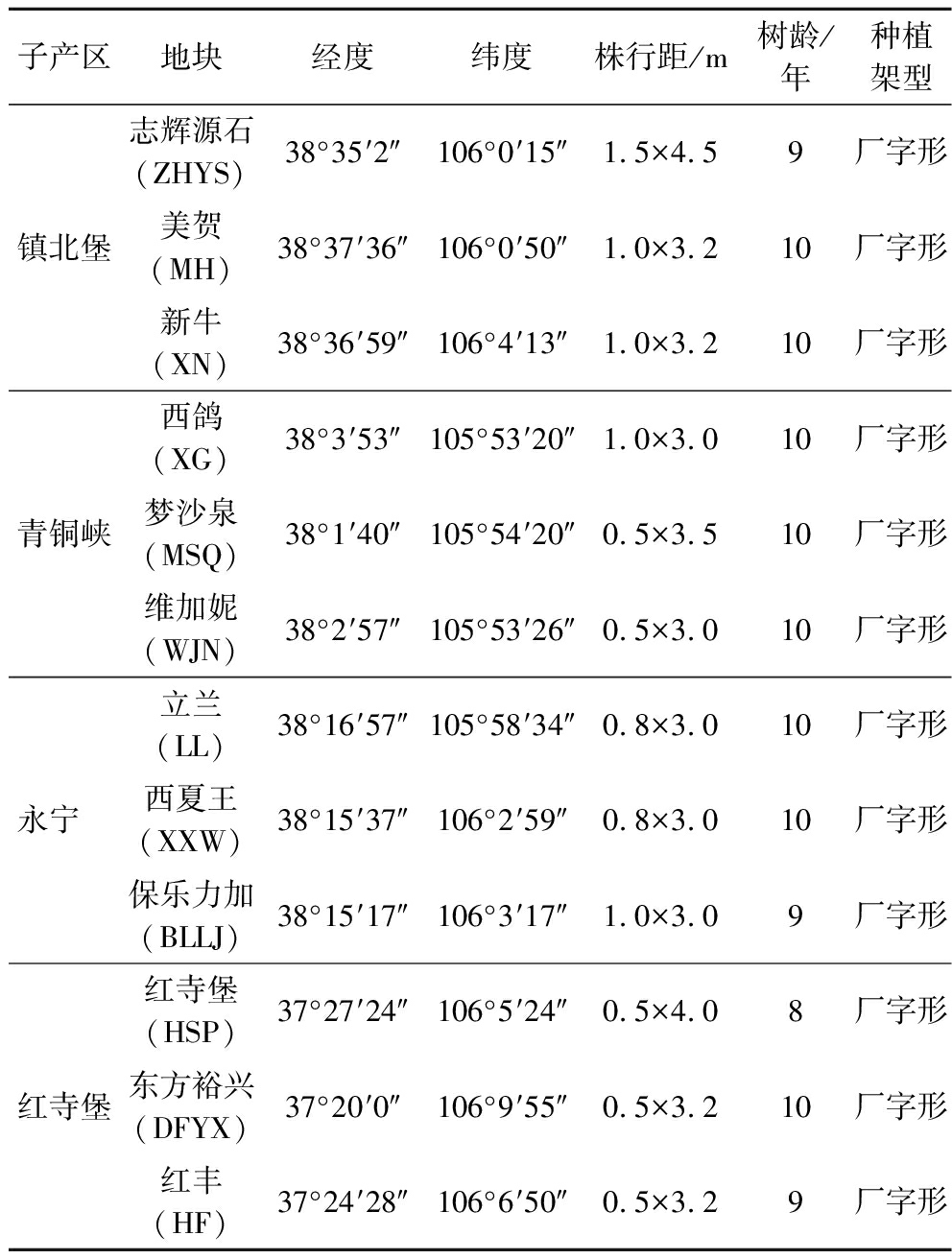 子产区地块经度纬度株行距/m树龄/年种植架型镇北堡志辉源石(ZHYS)38°35′2″106°0′15″1.5×4.59厂字形美贺(MH)38°37′36″106°0′50″1.0×3.210厂字形新牛(XN)38°36′59″106°4′13″1.0×3.210厂字形青铜峡西鸽(XG)38°3′53″105°53′20″1.0×3.010厂字形梦沙泉(MSQ)38°1′40″105°54′20″0.5×3.510厂字形维加妮(WJN)38°2′57″105°53′26″0.5×3.010厂字形永宁 立兰(LL)38°16′57″105°58′34″0.8×3.010厂字形西夏王(XXW)38°15′37″106°2′59″0.8×3.010厂字形保乐力加(BLLJ)38°15′17″106°3′17″1.0×3.09厂字形红寺堡红寺堡(HSP)37°27′24″106°5′24″0.5×4.08厂字形东方裕兴(DFYX)37°20′0″106°9′55″0.5×3.210厂字形红丰(HF)37°24′28″106°6′50″0.5×3.29厂字形