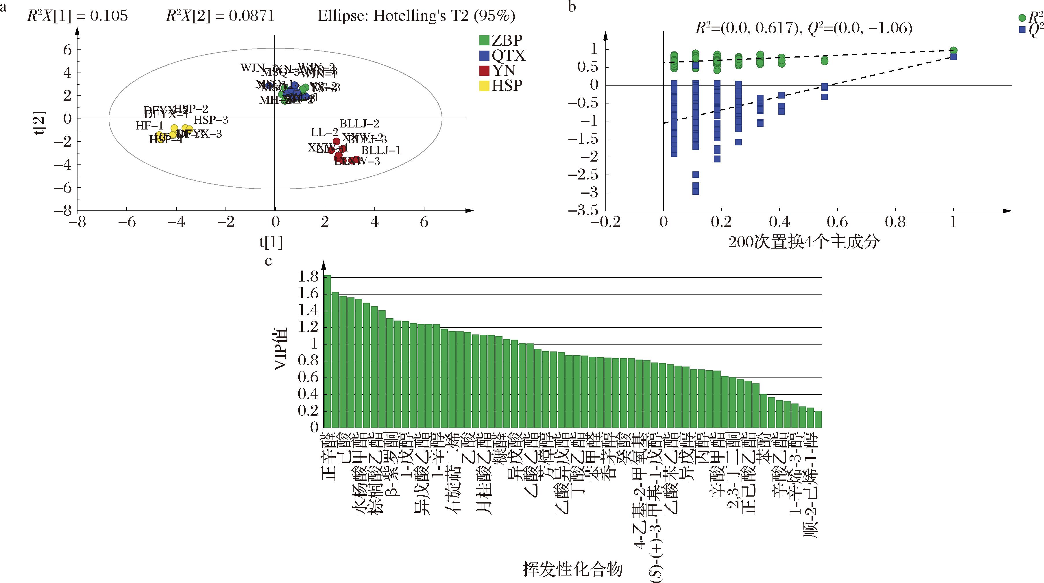 a-OPLS-DA得分图;b-模型交叉验证结果图;c-挥发性成分VIP图