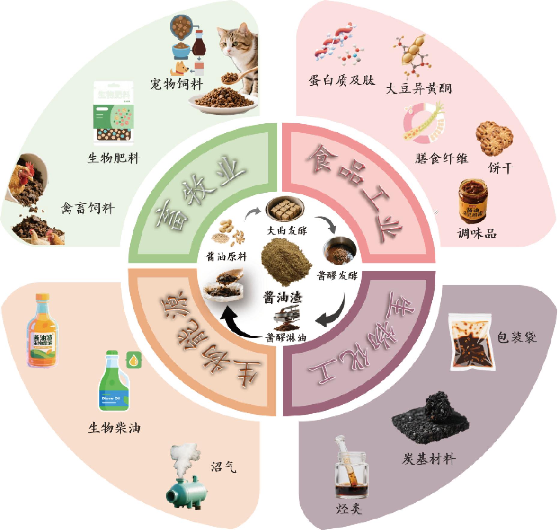 综上所述,酱油渣的综合利用呈现出“多领域应用、高低附加值并存”的特点(表1)。结合前文对酱油渣综合再利用现状的讨论,利用智能化发酵设备生产酱油渣饲料展现出较大的工业化应用潜力。相比之下,生物能源和生物化工产品的处理成本较高,且工艺复杂,但能生产可再生能源和化工环保材料,具有一定的应用前景。此外,酱油渣富含蛋白质、活性肽、膳食纤维、大豆异黄酮及美拉德反应香气物质等多种营养成分,这些成分为新型调味品的开发提供了高性价比原料,并能够显著提升其利用率,成为实现高附加值再利用的有效途径。
