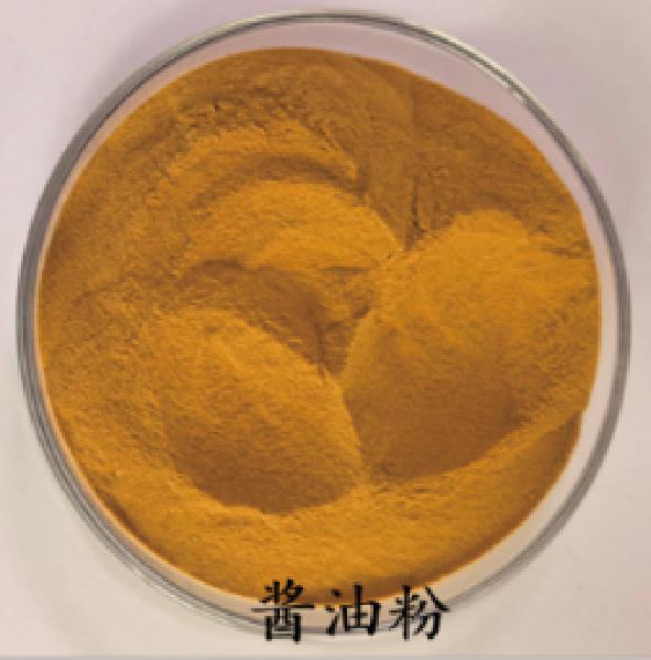 例如,张宗卫[3]将经过无害化处理的酱油渣(质量分数68%)添加到曲奇饼干中,制得的曲奇饼干膳食纤维含量是对照组的43.4倍,且各项理化指标和微生物指标均符合国家标准。张子岩等[59]以酱油渣为主要原料制备了低脂少盐的调味酱,含有6种人体必需氨基酸和6种呈味氨基酸,其中谷氨酸含量高达46.75 mg/g,其产品的品质优于市场上部分现有调味酱。杨静宜[9]对表层酱油渣物质及其特征味感信息进行了研究,发现表层酱油渣中的生物胺总量处于安全水平,且可溶性物质含量高达73.53%。此外,表层酱油渣富含鲜味氨基酸和疏水性氨基酸,在相同浓度下,表层酱油渣提取物的挥发性物质含量明显高于传统酱油,其中包含与酱油差异较大的特色香气物质,如4-乙基愈创木酚、2-庚酮、苯乙醇、4-乙基苯酚和1-辛烯-3-醇等,这些成分为开发高质量鲜味调味品提供了新的思路。基于以上研究成果,本课题组利用酱油渣油脂适度氧化生香技术、可控Maillard反应生香技术以及风味后修饰技术,成功开发出酱油粉(图3)。该产品符合国家食品安全标准,GB 31644—2018《食品安全国家标准 复合调味料》,并且在感官评价方面表现良好。