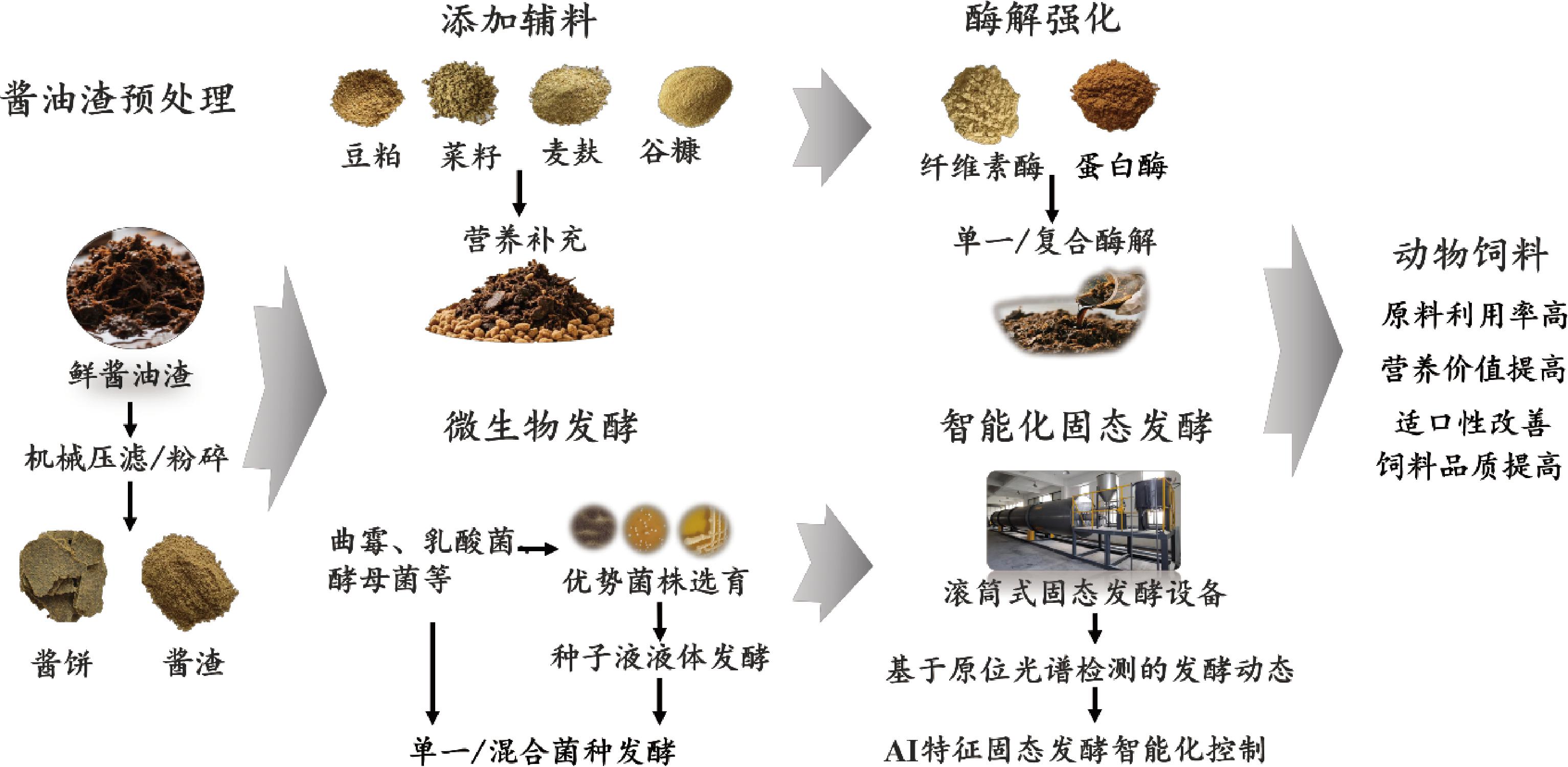 酱油渣作为酱油生产的副产物,尽管因其具有高盐、高水分、高油脂及营养成分不均等特性而面临一定的处理难度,但其资源化利用在多个领域已展现出广阔的潜力。从综合评价来看(表1),不同的利用方式具有各自的优劣势和可行性,生物饲料及高附加值营养食品开发具有较大的工业化潜力和利用价值,未来的研究应着重于工艺优化与资源利用效率的提升,从而推动酱油渣的高效、可持续利用,这也契合了酱油生产企业和社会对可持续发展的需求。未来的研究可从以下几个方向展开:a)目标菌株的筛选:通过高效微生物育种技术或合成生物学技术,改造发酵菌株,以增强其对酱油渣中难降解组分的生物转化能力,从而定向提高目标产物的产量和质量。b)工业发酵自动化控制技术:通过设计连续化、自动化发酵装备(如滚筒式固态发酵设备-自动化实时发酵监测),提高发酵过程的效率和质量,推动酱油渣在饲料加工中的规模化和产业化应用。c)高附加值产品研发:以酱油天然发酵渣为部分原料,综合利用油脂适度氧化生香技术、可控Maillard反应技术及风味后修饰技术,开发符合消费者需求的调味品基料。