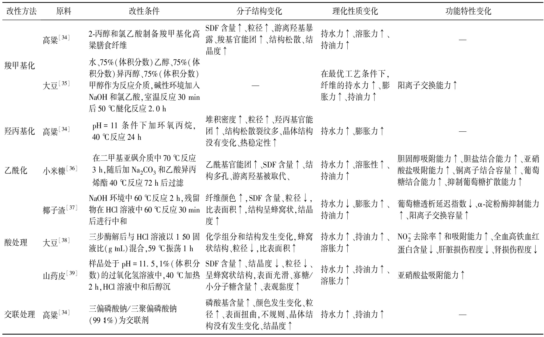 改性方法原料改性条件分子结构变化理化性质变化功能特性变化羧甲基化高粱[34]2-丙醇和氯乙酸制备羧甲基化高粱膳食纤维SDF含量↑、粒径↑、游离羟基暴露、羧基官能团↑、结构松散、结晶度↑持水力↑、溶胀力↑、持油力↑—大豆[35]水、75%(体积分数)乙醇、75%(体积分数)异丙醇、75%(体积分数)甲醇作为反应介质,碱性环境加入NaOH和氯乙酸,室温反应30 min后50 ℃醚化反应2.0 h—在最优工艺条件下,纤维的持水力↑、膨胀力↑、持油力↑阳离子交换能力↑羟丙基化高粱[34]pH=11条件下加环氧丙烷,40 ℃反应24 h堆积密度↑、粒径↑、羟丙基官能团↑、结构松散裂纹多、晶体结构没有变化、热稳定性↑持水力↑、膨胀力↑—乙酰化小米糠[36]在二甲基亚砜介质中70 ℃反应3 h,随后加Na2CO3和乙酸异丙烯酯40 ℃反应72 h后过滤乙酰基官能团↑、SDF含量↑、结构多孔、游离羟基被取代、持水力↑、溶胀性↑、持油力↑胆固醇吸附能力↑、胆盐结合能力↑、亚硝酸盐吸附能力↑、铜离子结合容量↑、葡萄糖结合能力↑、抑制葡萄糖扩散能力↑酸处理椰子渣[37]NaOH环境中60 ℃反应2 h,残留物在HCl溶液中60 ℃反应30 min后进行中和纤维颜色↑,SDF含量、粒径↓,比表面积↑,结构呈蜂窝状,结晶度↑持水力↓、膨胀力↑、持油力↑葡萄糖透析延迟指数↓、α-淀粉酶抑制能力↑、阳离子交换容量↑大豆[38]三步酶解后与HCl溶液以1∶50固液比(g∶mL)混合,59 ℃振荡1 h化学组分和结构发生变化,蜂窝状结构、粒径↓,比表面积↑持水力↑、持油力↑、溶胀力↑NO-2去除率↑和吸附能力↑、全血高铁血红蛋白含量↓、肝脏损伤程度↓、肾损伤程度↓山药皮[39]样品处于pH=11.5,1%(体积分数)的过氧化氢溶液中,40 ℃加热2 h,HCl溶液中和后醇沉SDF含量↑、结晶度↓、粒径↓、呈蜂窝状结构,表面光滑、寡糖/小分子糖含量↑、表观黏度↑持水力↑、持油力↑、溶胀力↑亚硝酸盐吸附能力↑交联处理高粱[34]三偏磷酸钠/三聚偏磷酸钠(99∶1%)为交联剂磷酸基含量↑、颜色发生变化、粒径↑、表面扭曲,不规则、晶体结构没有发生变化、结晶度↑持水力↑、持油力↑—
