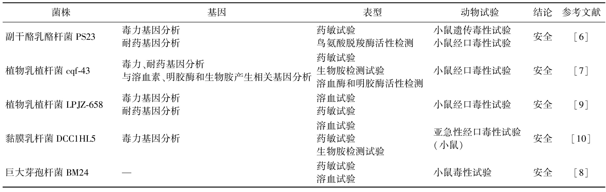 首先对待评价菌株进行全基因组序列分析,检测其是否存在毒力基因、耐药基因以及与产生有毒代谢产物相关的基因。如表1所示,LI等[6]对副干酪乳酪杆菌PS23进行安全性分析,发现其不含毒力或抗生素耐药性相关的基因,从而表明该菌株安全性较高。
