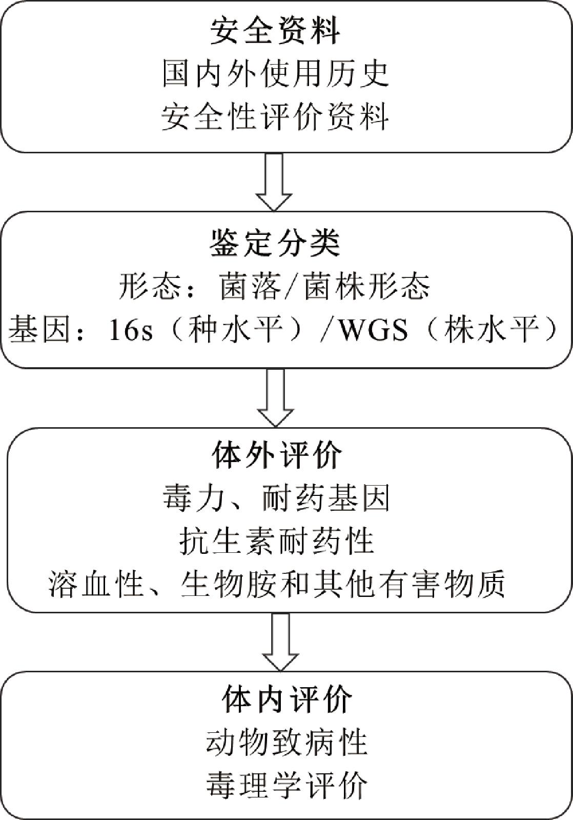 根据国内外对益生菌安全性评价的官方指南和相关学者的研究进展总结,益生菌的安全性评价主要包括对待评价菌株的国内外使用历史及安全性评价资料进行综合分析、对菌株进行鉴定分类、体外评价包括但不限于抗生素耐药性、溶血性和生物胺等在内的有害物质检测以及对菌株进行动物体内的致病性和毒理评价4个步骤,如图1所示。