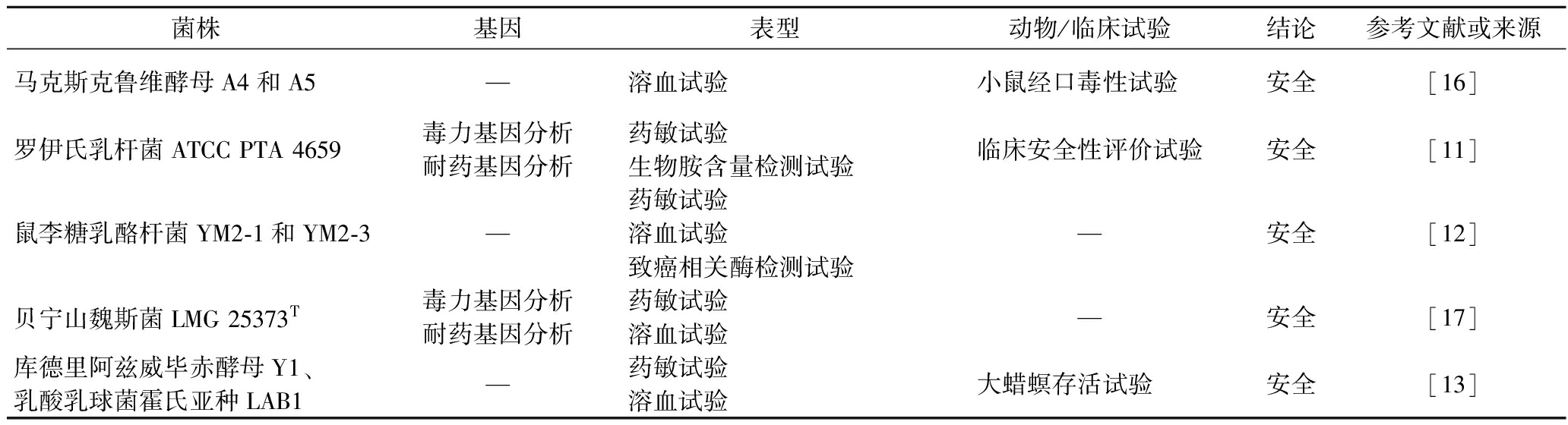 菌株基因表型动物/临床试验结论参考文献或来源马克斯克鲁维酵母A4和A5—溶血试验小鼠经口毒性试验 安全[16]罗伊氏乳杆菌ATCC PTA 4659毒力基因分析耐药基因分析药敏试验生物胺含量检测试验临床安全性评价试验安全[11]鼠李糖乳酪杆菌YM2-1和YM2-3—药敏试验溶血试验致癌相关酶检测试验—安全[12]贝宁山魏斯菌LMG 25373T毒力基因分析耐药基因分析药敏试验溶血试验—安全[17]库德里阿兹威毕赤酵母Y1、乳酸乳球菌霍氏亚种LAB1—药敏试验溶血试验大蜡螟存活试验 安全[13]