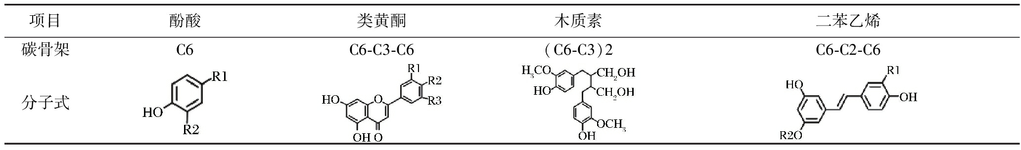 项目酚酸类黄酮木质素二苯乙烯碳骨架C6C6-C3-C6(C6-C3)2C6-C2-C6分子式